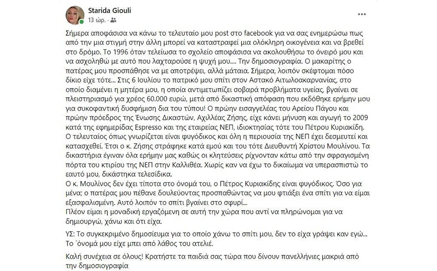 «Σήμερα αποφάσισα να κάνω το τελευταίο μου post στο facebook για να σας ενημερώσω πως από την μια στιγμή στην άλλη μπορεί να καταστραφεί μια ολόκληρη οικογένεια και να βρεθεί στο δρόμο. Το 1996 όταν τελείωσα το σχολείο αποφάσισα να ακολουθήσω το όνειρό μου και να ασχοληθώ με αυτό που λαχταρούσε η ψυχή μου…. Την δημοσιογραφία.