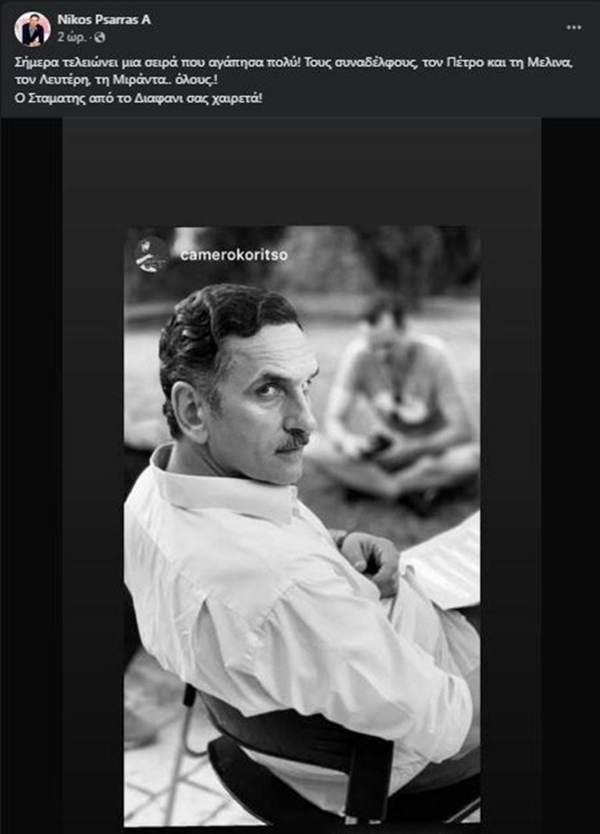 «Σήμερα τελειώνει μια σειρά που αγάπησα πολύ! Τους συναδέλφους, τον Πέτρο και τη Μελίνα, τον Λευτέρη, τη Μιράντα.. όλους! Ο Σταμάτης από το Διαφάνι σας χαιρετά» έγραψε ο Νίκος Ψαρράς στον προσωπικό του λογαριασμό στο Facebook.