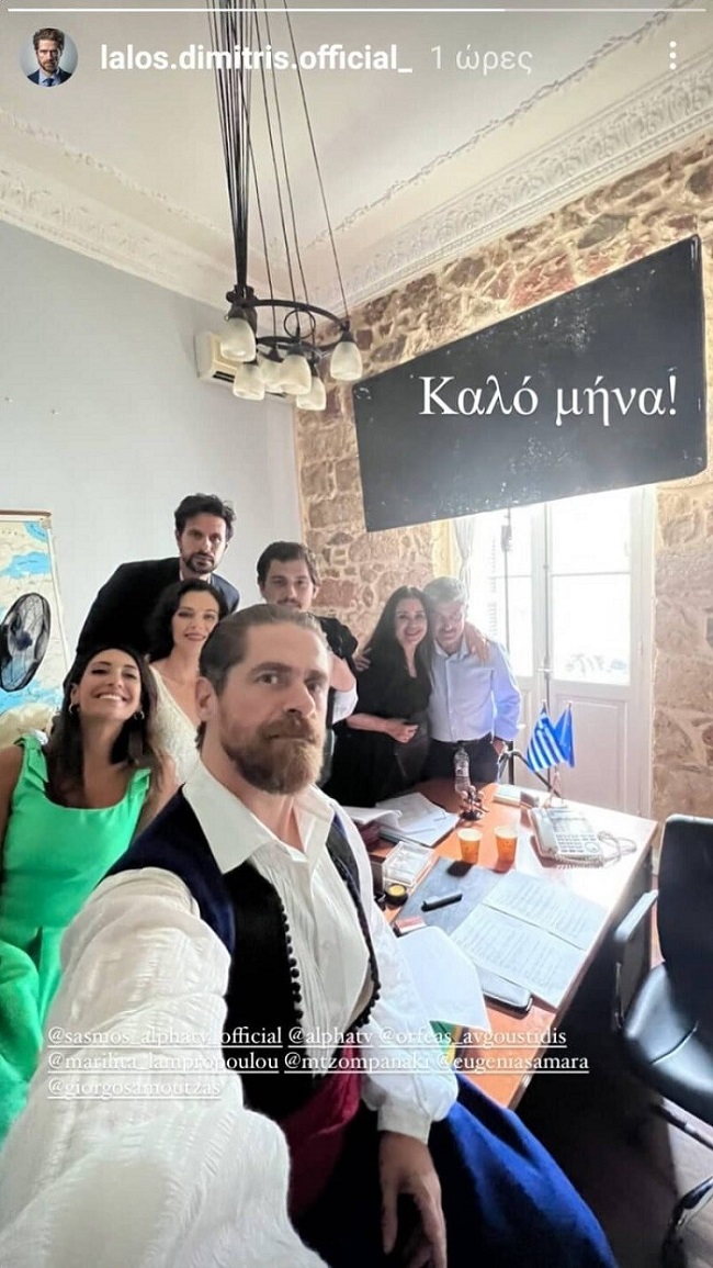Στη φωτογραφία που ανέβασε ποζάρει στο αστυνομικό τμήμα, μαζί με τους Δημήτρη Ήμελλο, Μαρία Τζομπανάκη, Ορφέα Αυγουστίδη, Γιώργο Αμούτζα και Ευγενία Σαμαρά, ενώ μαζί τους, φορώντας το νυφικό της, είναι και η Μαριλίτα Λαμπροπούλου.