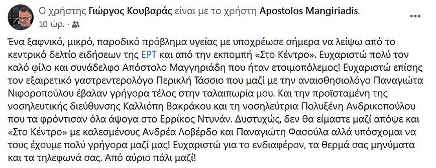 «Ένα ξαφνικό, μικρό, παροδικό πρόβλημα υγείας με υποχρέωσε σήμερα να λείψω από το κεντρικό δελτίο ειδήσεων της ΕΡΤ και από την εκπομπή “Στο Κέντρο”. Ευχαριστώ πολύ τον καλό φίλο και συνάδελφο Απόστολο Μαγγηριάδη που ήταν ετοιμοπόλεμος! Ευχαριστώ επίσης τον εξαιρετικό γαστρεντερολόγο Περικλή Τάσσιο που μαζί με την αναισθησιολόγο Παναγιώτα Νιφοροπούλου έβαλαν γρήγορα τέλος στην ταλαιπωρία μου. Και την προϊσταμένη της νοσηλευτικής διεύθυνσης Καλλιόπη Βακράκου και τη νοσηλεύτρια Πολυξένη Ανδρικοπούλου που τα φρόντισαν όλα άψογα στο Ερρίκος Ντυνάν.