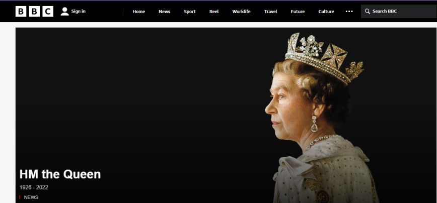 Το BBC από την πρώτη στιγμή που έγινε γνωστό πως η κατάσταση της υγείας της Βασίλισσας Ελισάβετ παρουσίασε επιδείνωση, είχε συνεχή ροή με όλες τις εξελίξεις και όλες τις κινήσεις που γινόντουσαν στο παλάτι. Όταν ανακοινώθηκε ο θάνατός της, η φάσα που υπάρχει στο πάνω μέρος του site έγινε μαύρη σε ένδειξη πένθους ενώ επέλεξε μια φωτογραφία της βασίλισσας με μαύρο φόντο η οποία συνοδεύτηκε με το λιτό «Η μεγαλειότητά της η βασίλισσα».