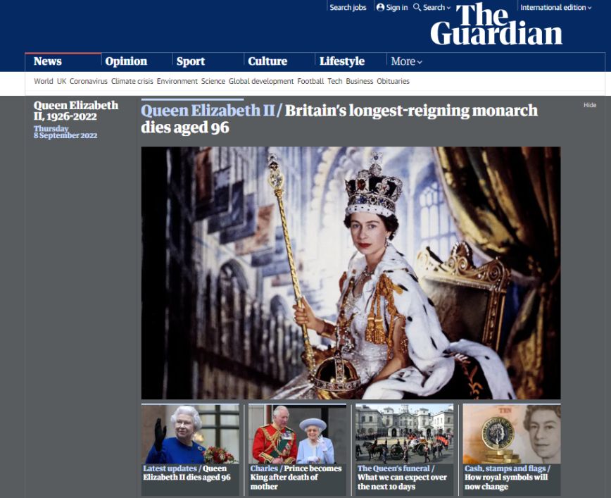 Με τον τίτλο: «Η βασίλισσα Ελισάβετ Β’, η μακροβιότερη μονάρχης της Βρετανίας, πέθανε σε ηλικία 96 ετών» ανακοίνωση η Guardian το θάνατο της βασίλισσας Ελισάβετ. Η είδηση συνοδεύτηκε με μια από τις κλασικές φωτογραφίες της βασίλισσας η οποία τραβήχτηκε σε νεαρή ηλικία.