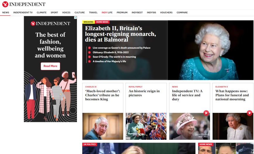 «Η Ελισάβετ Β’, η μακροβιότερη μονάρχης της Βρετανίας, πέθανε στο Balmoral» ήταν ο τίτλος του Independent το οποίο συνόδευσε την είδηση με μια πιο πρόσφατη και χαμογελαστή φωτογραφία της βασίλισσας.