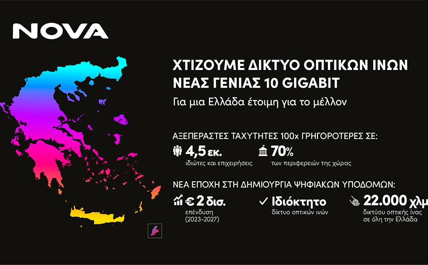 Επένδυση ύψους 2 δισ. ευρώ έως το 2027 για τη δραστηριότητά της στην Ελλάδα ανακοινώνει η United Group, o κορυφαίος πάροχος τηλεπικοινωνιών και media στη Νοτιοανατολική Ευρώπη. Η επένδυση αυτή έρχεται να προστεθεί στην προηγούμενη, ύψους 1,5 δισ. ευρώ, που πραγματοποίησε η United Group τα τελευταία 2 χρόνια. Στο πλαίσιο αυτό, η Νοva θα αναπτύξει υπερσύγχρονο δίκτυο οπτικών ινών 10 Gigabit, παρέχοντας κάλυψη με οπτική ίνα μέχρι το σπίτι (Fiber to the Home) στο 40% του ελληνικού πληθυσμού, καθώς και σε επιχειρήσεις, καλύπτοντας το 70% των Περιφερειών της χώρας. Με την επένδυση αυτή η Nova θα εγκαταστήσει υποδομές για το μέλλον, με την ανάπτυξη22.000 χιλιομέτρων οπτικών ινών νέας γενιάς, που θα ανταποκρίνονται στις αυξανόμενες ανάγκες για υπερυψηλές ταχύτητες. Πολύ σύντομα οι συνδρομητές της Nova θα μπορούν να απολαύσουν ταχύτητες 1 Gigabit, μέσα από το λανσάρισμα νέων εμπορικών πακέτων οπτικής ίνας για το σπίτι (FTTH) .