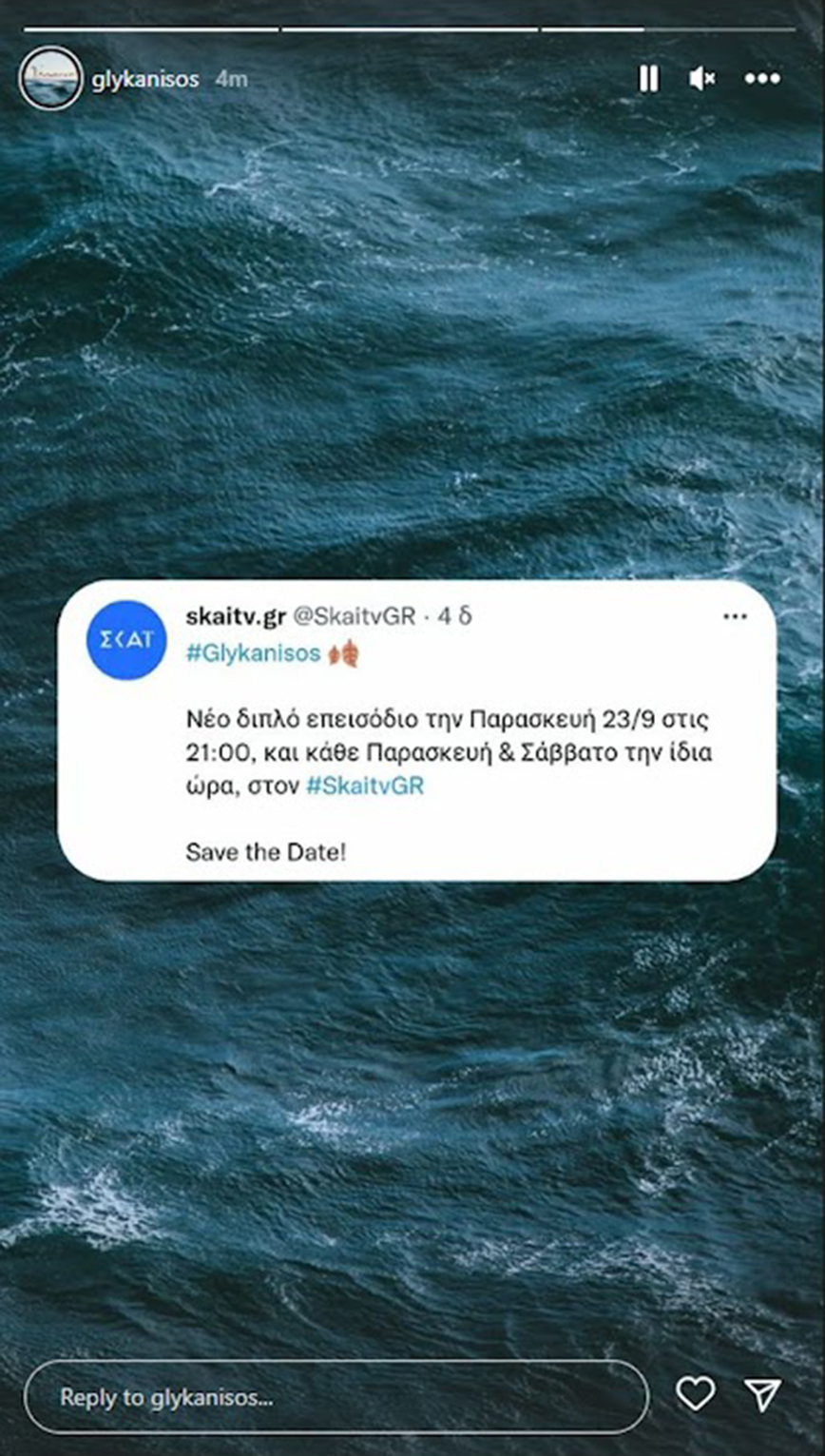 Ο σταθμός με ένα μήνυμα στον επίσημο λογαριασμό της σειράς στο Instagram έκανε γνωστό πως ο Γλυκάνισος θα επανέλθει την Παρασκευή 23/09 στις 21:00 με διπλό επεισόδιο και από δω και πέρα θα προβάλλεται κάθε Παρασκευή και Σάββατο την ίδια ώρα.