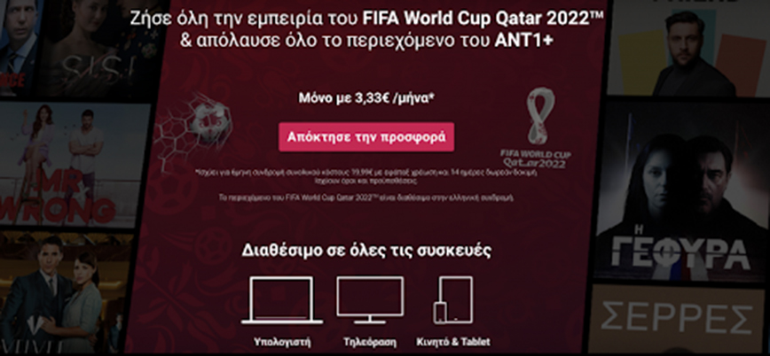 Η πλατφόρμα Ant1 ανανέωσε το πακέτο για όσους θέλουν να παρακολουθήσουν το Μουντιάλ και το προσφέρει σε μια δελεαστική τιμή.