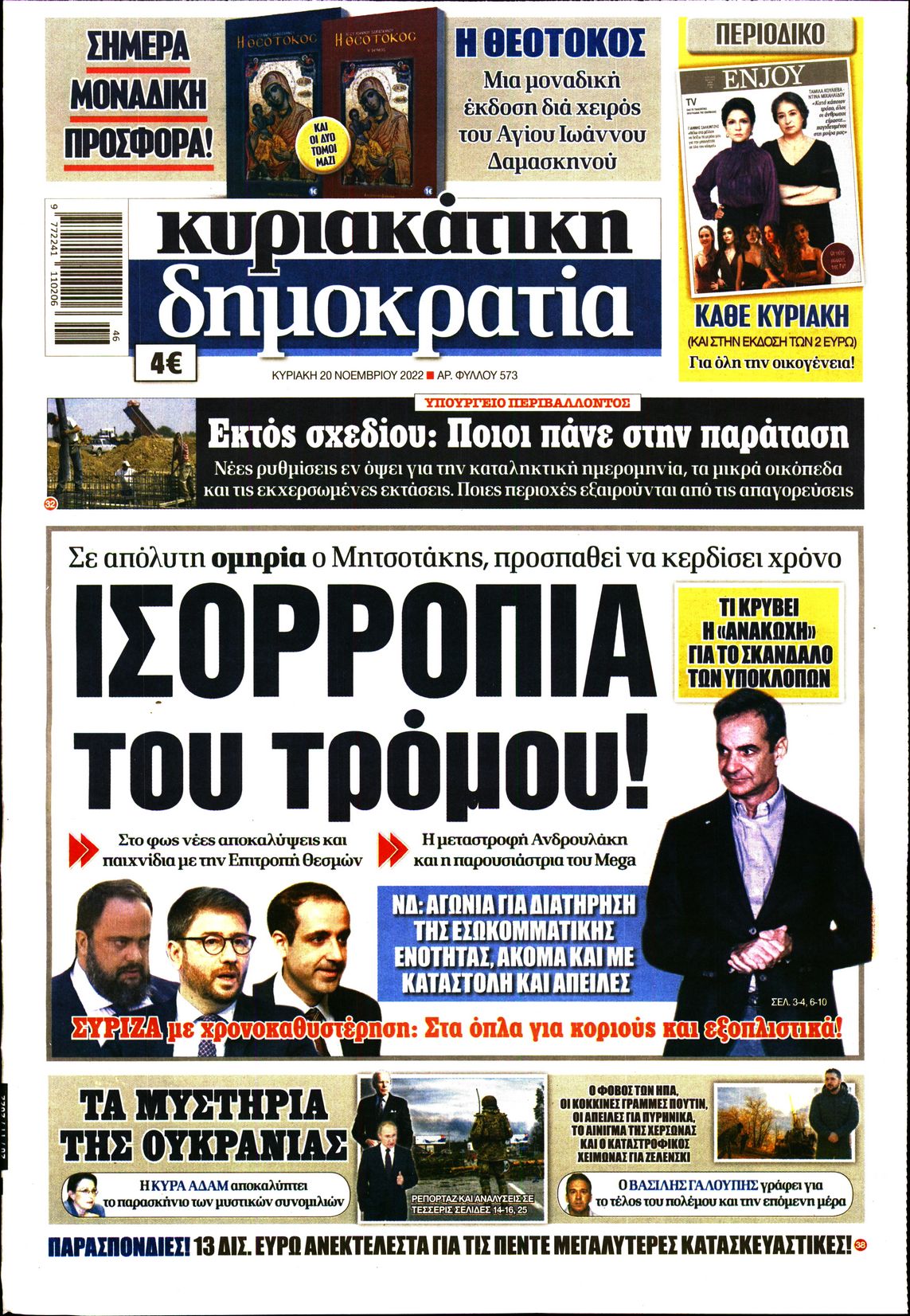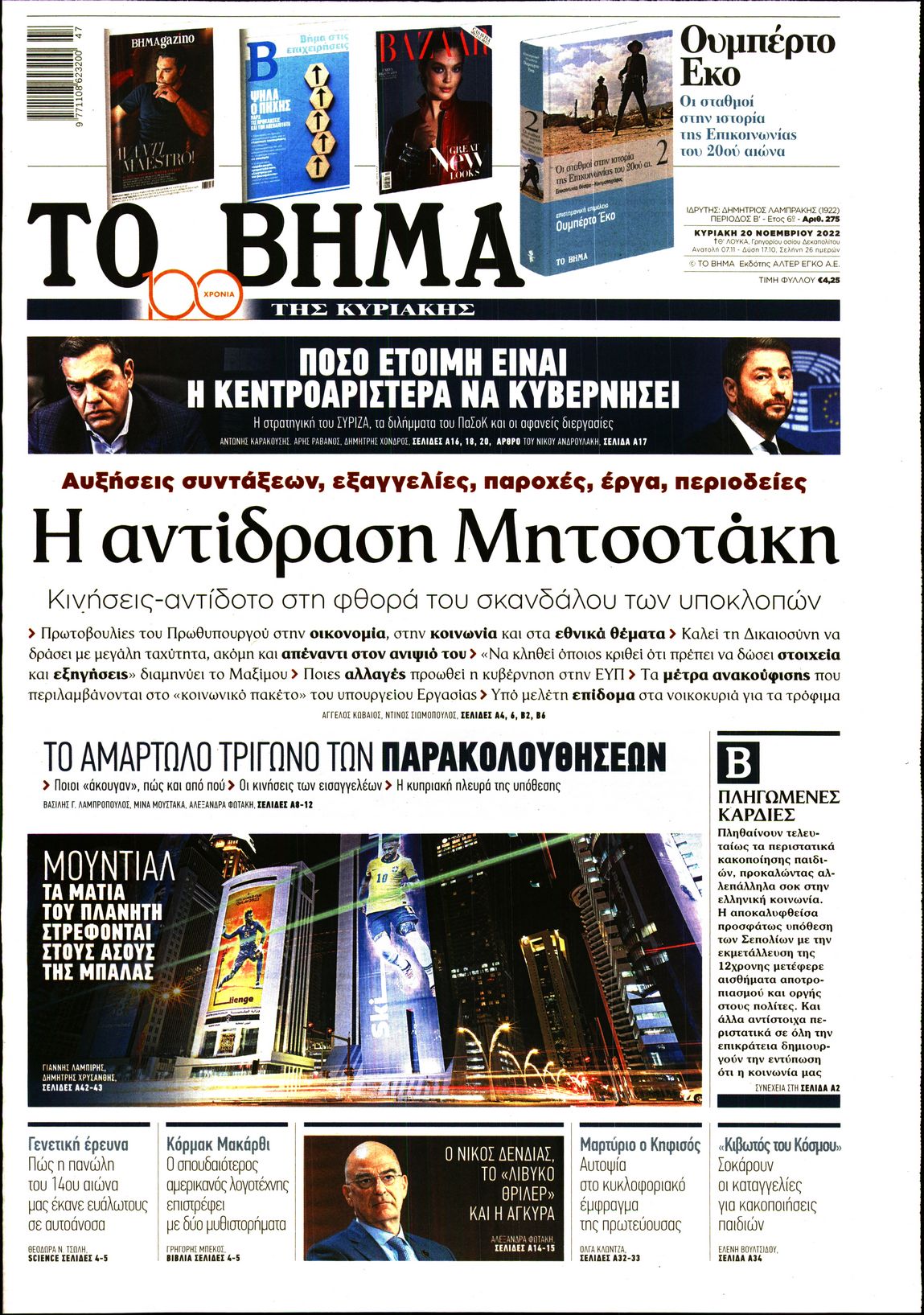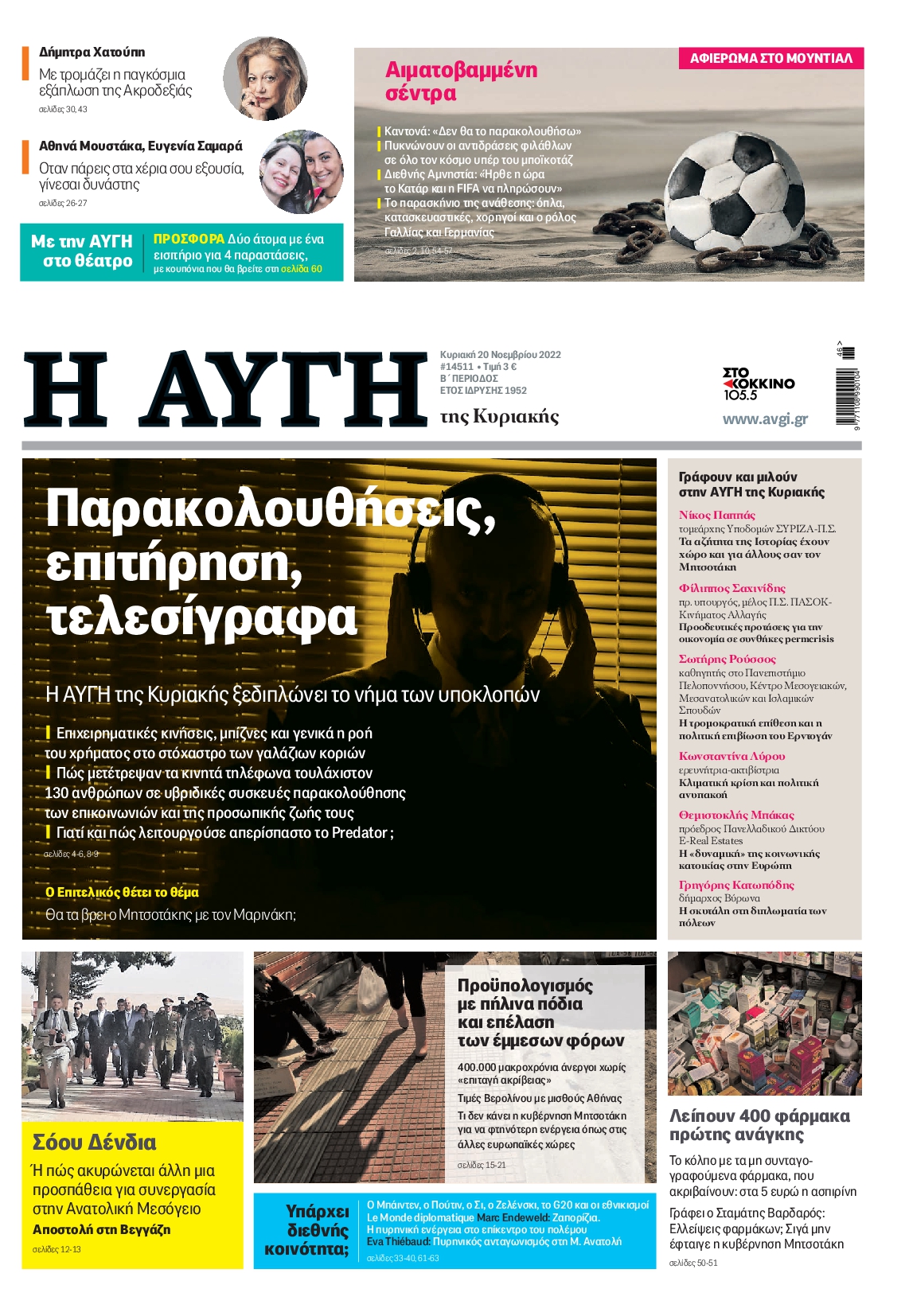 Οι καταγγελίες για την Κιβωτό του Κόσμου, η έναρξη του Παγκοσμίου Κυπέλλου στο Κατάρ, και οι κυβερνητικές κινήσεις με το βλέμα στις εκλογές ξεχωρίζουν μεταξύ άλλων θεμάτων στα πρωτοσέλιδα των κυριακάτικων εφημερίδων.