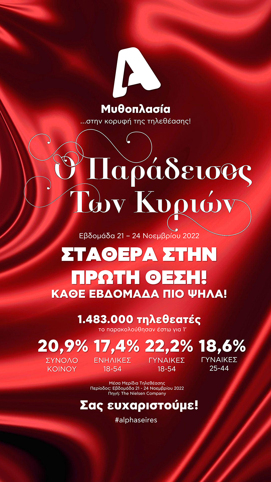Στη μεγάλη, πλούσια και λαμπερή παραγωγή του Alpha, η οποία μεταφέρει το θεατή στην αστική Αθήνα της δεκαετίας του ’60, έδωσαν την ψήφο τους οι γυναίκες 18-54 με 22,2% καθώς και οι γυναίκες 25-44 με 18,6%.