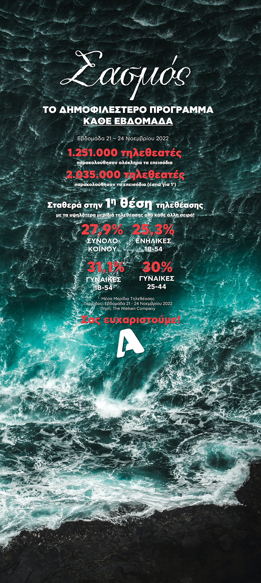 Τα σκήπτρα της τηλεθέασης κράτησε και την εβδομάδα 21 με 24 Νοεμβρίου 2022 η μυθοπλασία του Alpha με τον «Σασμό» και τον «Παράδεισο των κυριών», να βρίσκονται στην κορυφή.
