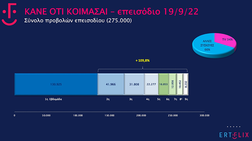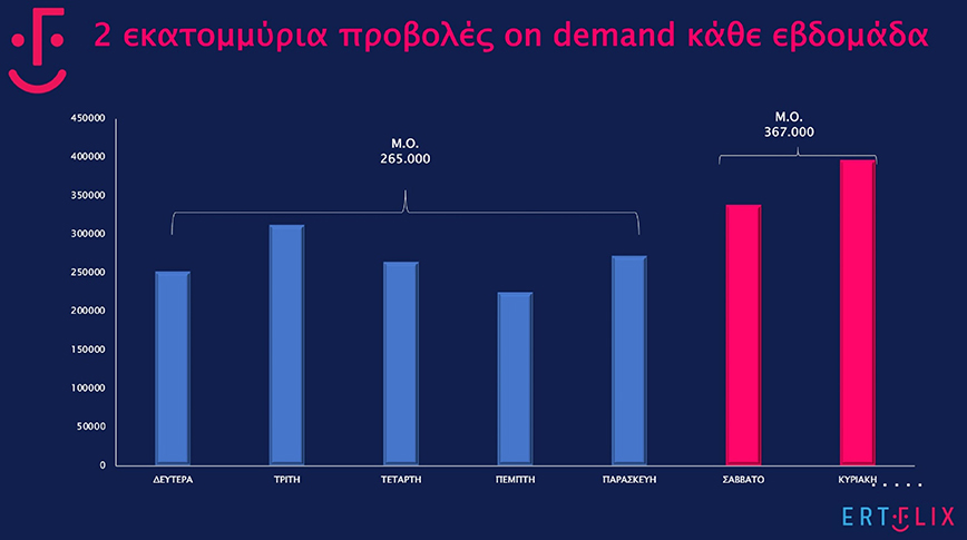Είναι αποκαλυπτικό το στοιχείο ότι 66% των τηλεθεατών βλέπουν ERTFLIX από άλλες συσκευές και όχι από την TV τους και αυτό δεν προσμετράται σε καμία έρευνα τηλεθέασης. Σύμφωνα με τα στοιχεία του διεθνούς λογισμικού συστήματος YOUBORA που χρησιμοποιούν και πολλές διεθνείς πλατφόρμες, το 28% των τηλεθεατών μπαίνει στο ERTFLIX από κινητό τηλέφωνο, το 25% από υπολογιστές και το 13% από τάμπλετ. Σε αριθμούς από τις 2 εκ. επισκέψεις που δέχεται κάθε εβδομάδα το ERTFLIX μόνον οι 700.000 γίνονται μέσα από την τηλεόραση. Οι «υπόλοιπες» 1,3 εκ. γίνονται μέσα από άλλες συσκευές και δεν είχαν καταγραφεί ποτέ έως τώρα. Όσοι βλέπουν on demand μια σειρά της ΕΡΤ μέσα από το κινητό τους τηλέφωνο (28%) είναι σχεδόν όσοι τη βλέπουν on demand και μέσω smart TV (34%).