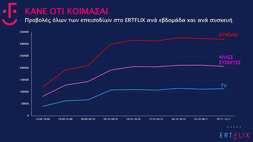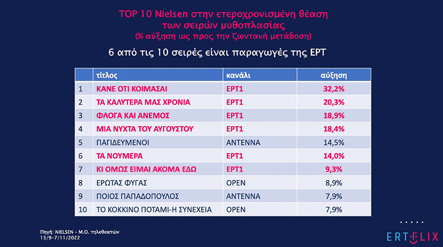 Ο Πρόεδρος της ΕΡΤ έδωσε και στοιχεία αντίστοιχα για τις πρώτες θέσεις δημοτικότητας στο ERTFLIX στο ίδιο διάστημα των 9 εβδομάδων (από 12/9 έως 13/11) που προήλθαν μέσα από το YOUBORA. Εδώ φαίνεται και η μεγάλη επιτυχία των φετινών σειρών μυθοπλασίας της ΕΡΤ με αριθμούς ρεκόρ. Τα 9 διπλά επεισόδια του «Κάνε ότι κοιμάσαι» που προβλήθηκαν σ’ αυτό το διάστημα δέχθηκαν περισσότερες από 2,3 εκατομμύρια επισκέψεις και ακολουθεί το «Χαιρέτα μου τον Πλάτανο» με 1,4 εκ., τα «Καλύτερά μας χρόνια» με 1,1 εκ., «Τα Νούμερα» με 840.000 προβολές, η «Φλόγα και άνεμος», η «Νύχτα του Αυγούστου» με περισσότερες από 500.000 προβολές.
