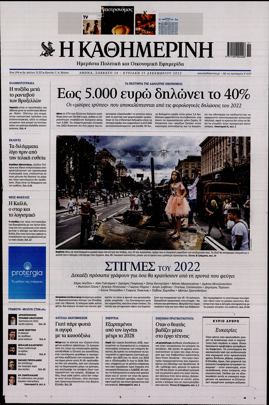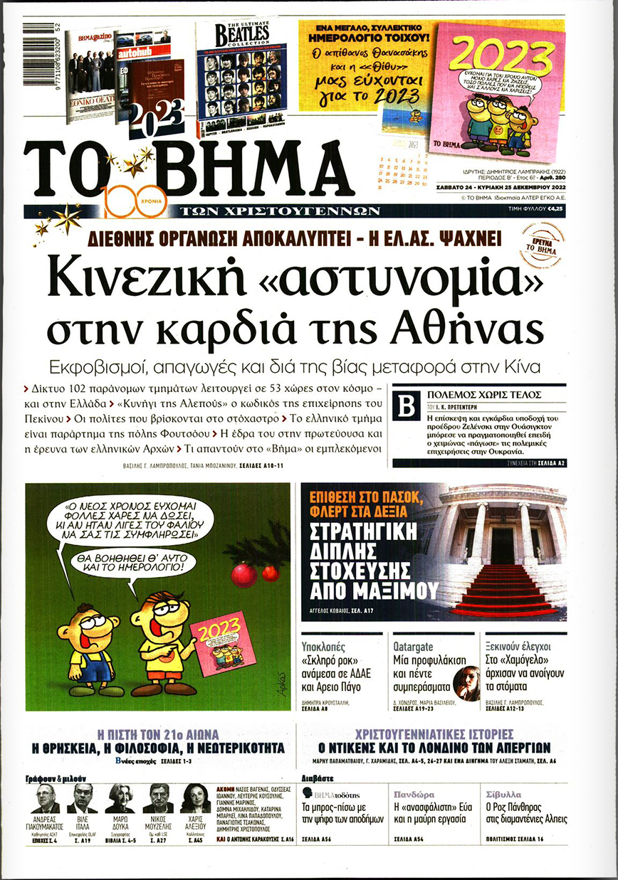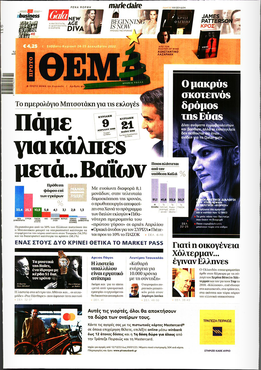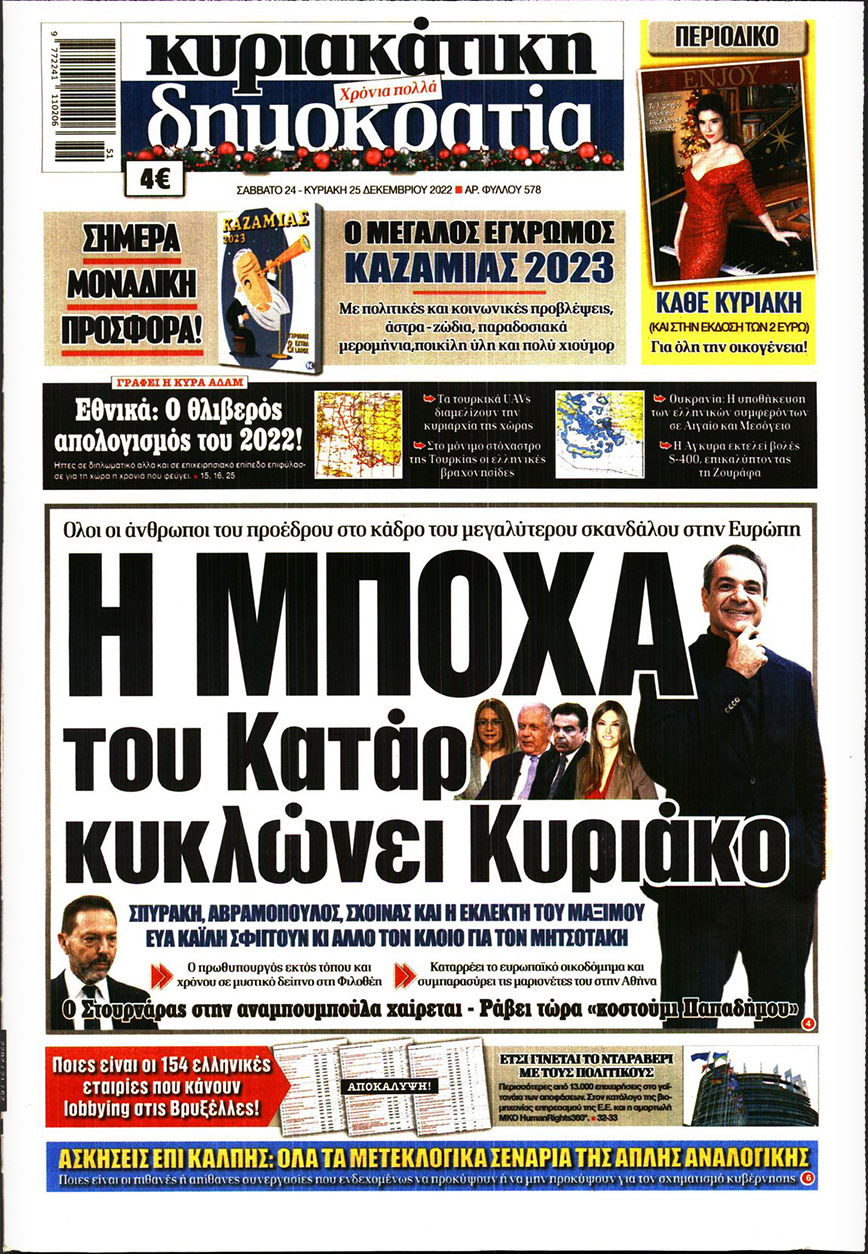 Το σκάνδαλο του Qatar Gate με την παραμονή της Εύας Καϊλή στη φυλακή, η οικονομία, αλλά και οι εκλογές που έρχονται το 2023 φιγουράρουν στα πρωτοσέλιδα των κυριακάτικων εφημερίδων, τα οποία κυκλοφορούν εκτάκτως το Σάββατο λόγω της αργίας των Χριστουγέννων.