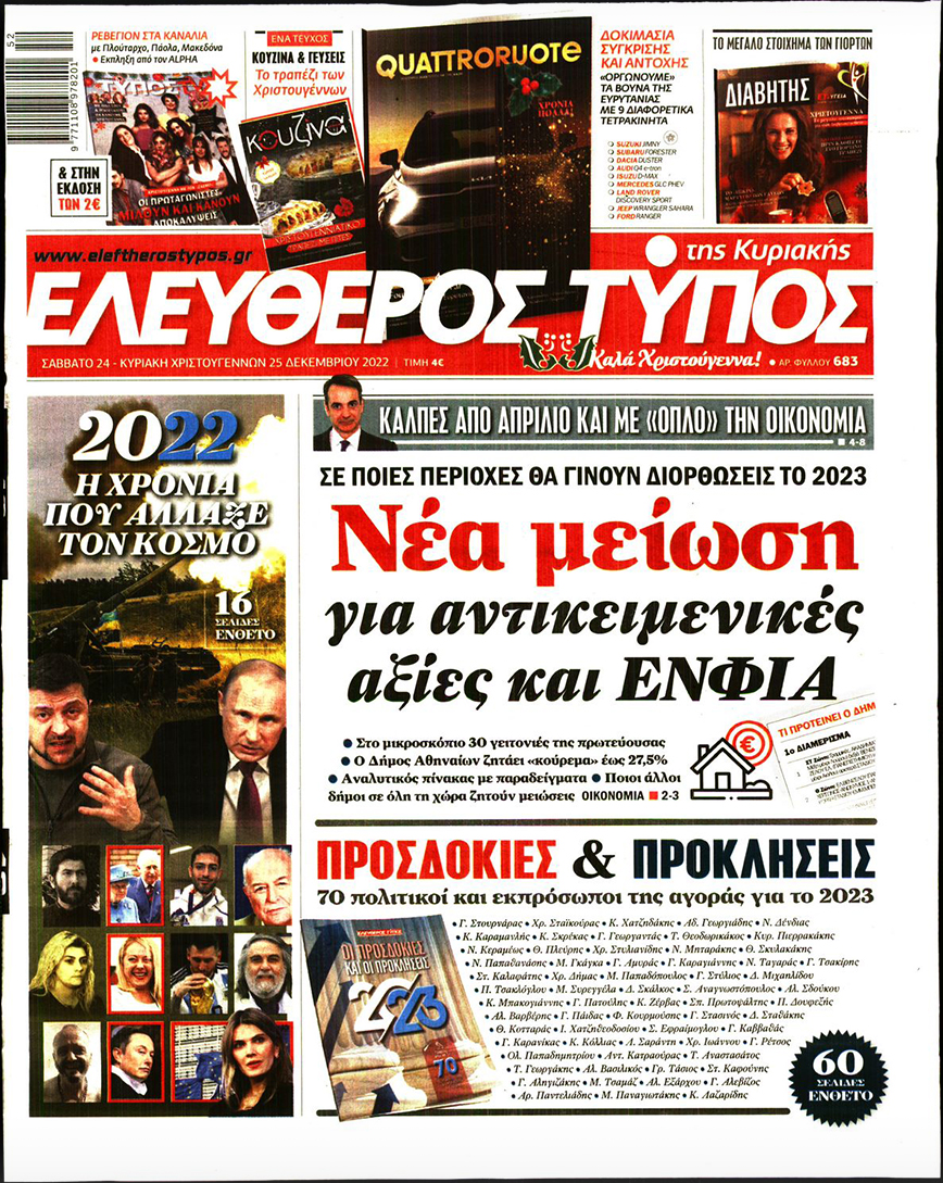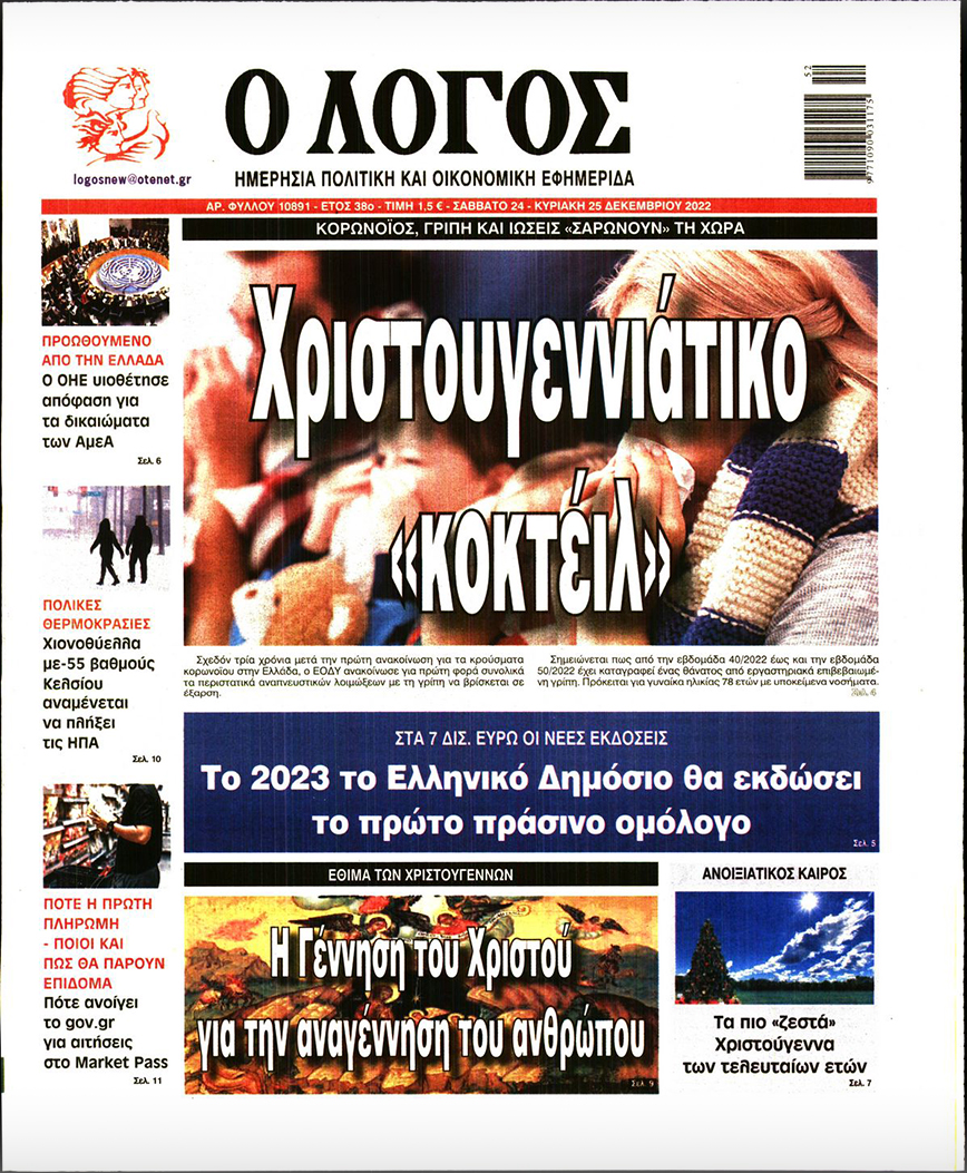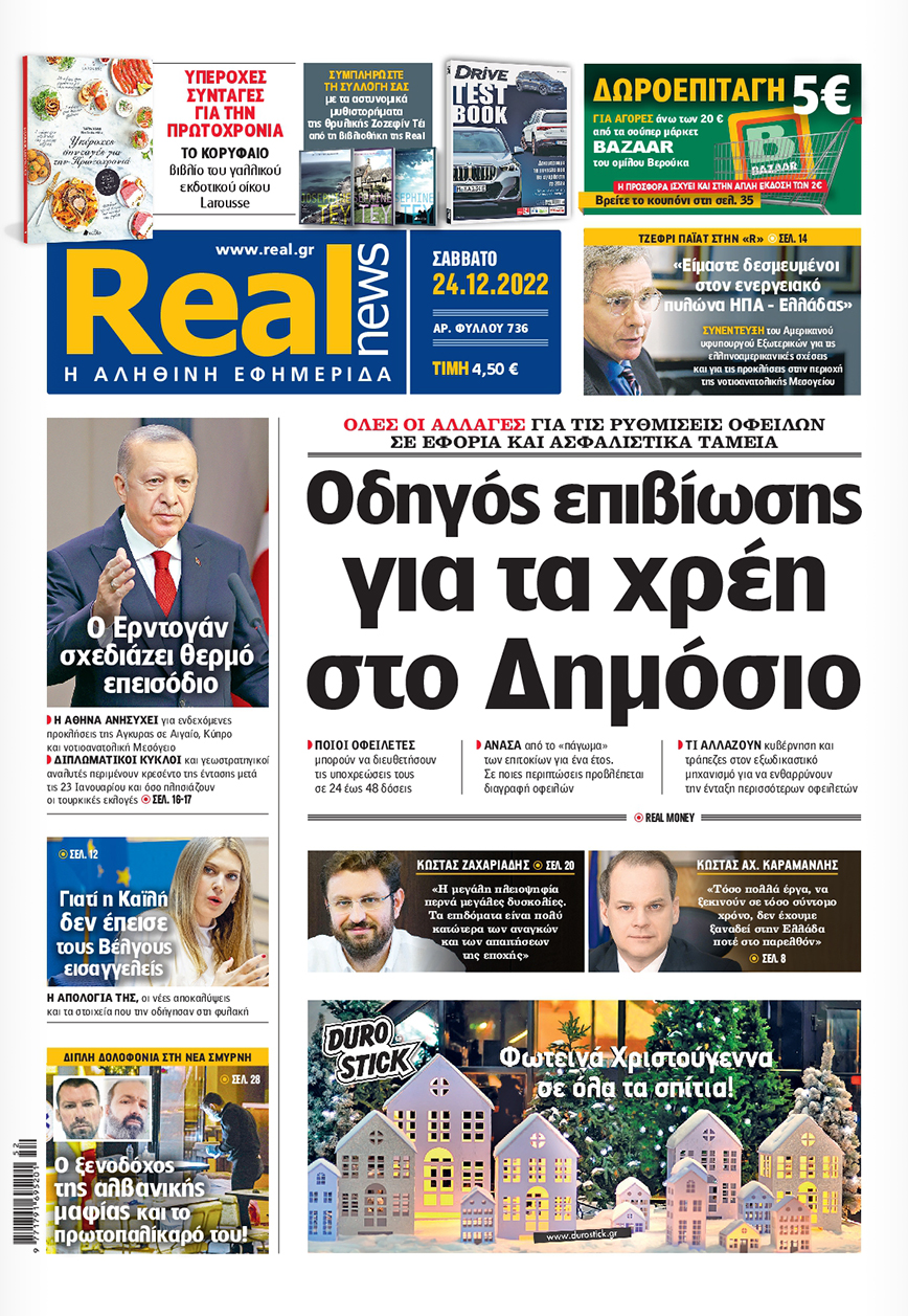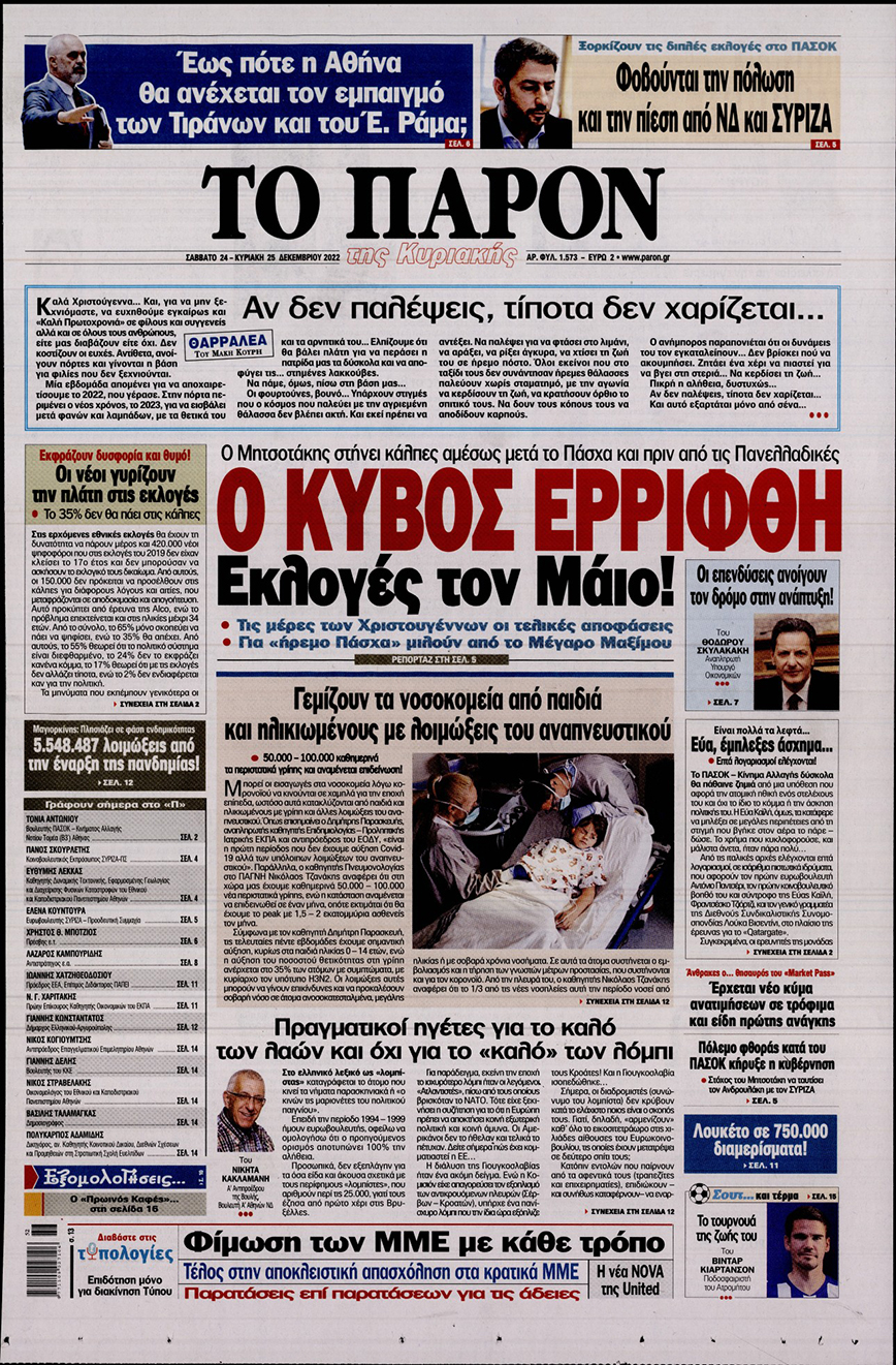 Το σκάνδαλο του Qatar Gate με την παραμονή της Εύας Καϊλή στη φυλακή, η οικονομία, αλλά και οι εκλογές που έρχονται το 2023 φιγουράρουν στα πρωτοσέλιδα των κυριακάτικων εφημερίδων, τα οποία κυκλοφορούν εκτάκτως το Σάββατο λόγω της αργίας των Χριστουγέννων.