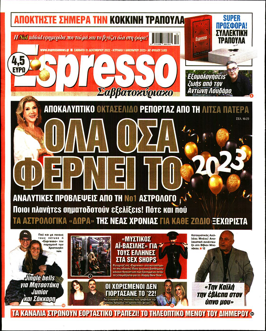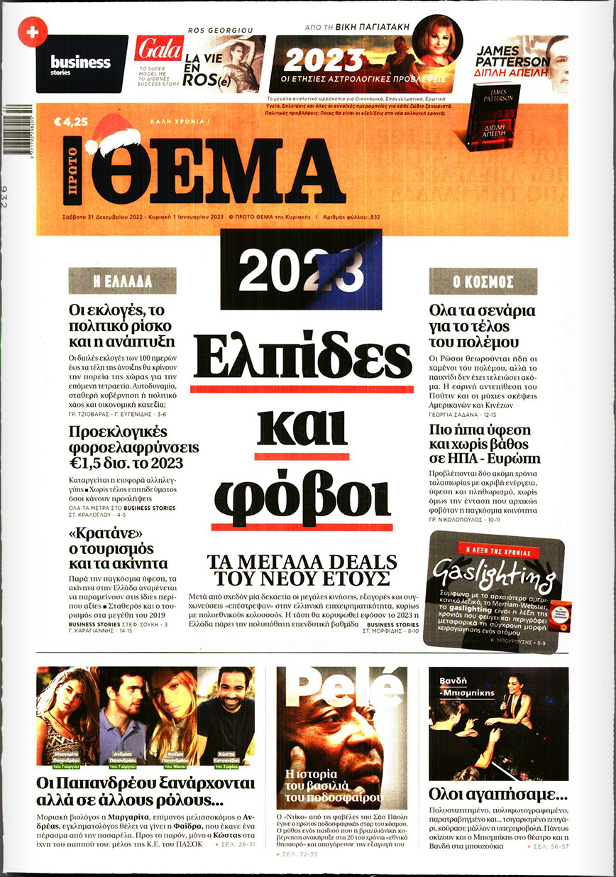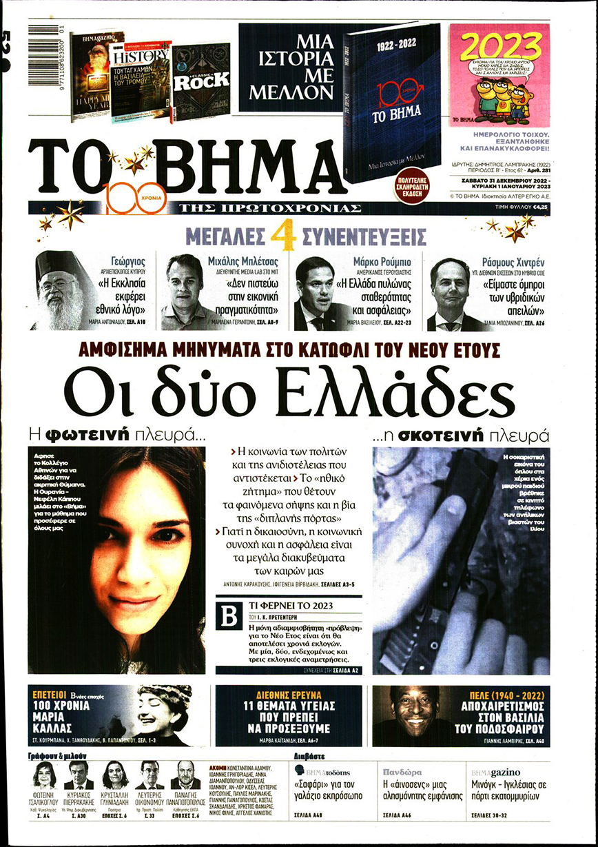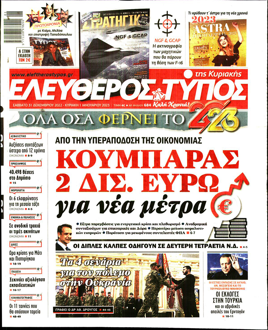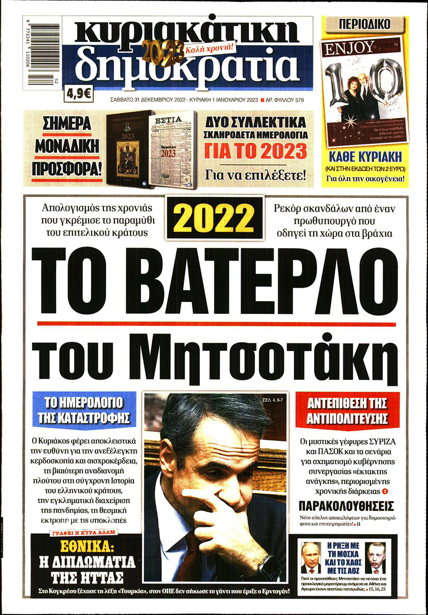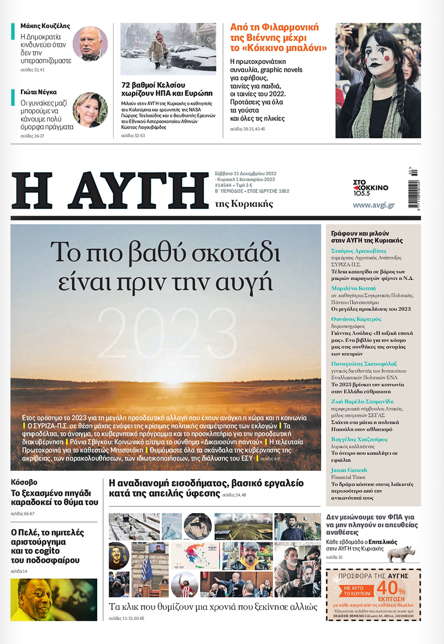 Το 2022 φεύγει και το 2023 έρχεται και τα πρωτοσέλιδα των κυριακάτικων εφημερίδων, που κυκλοφορούν εκτάκτως το Σάββατο λόγω της αργίας της Πρωτοχρονιάς, γράφουν για τις προκλήσεις του νέου… εκλογικού έτους.