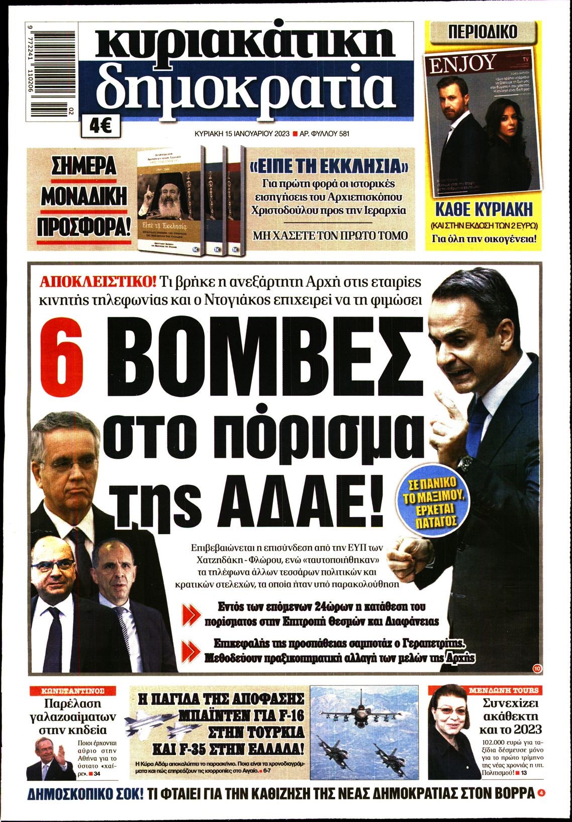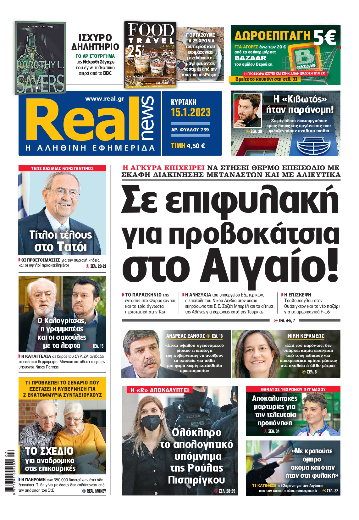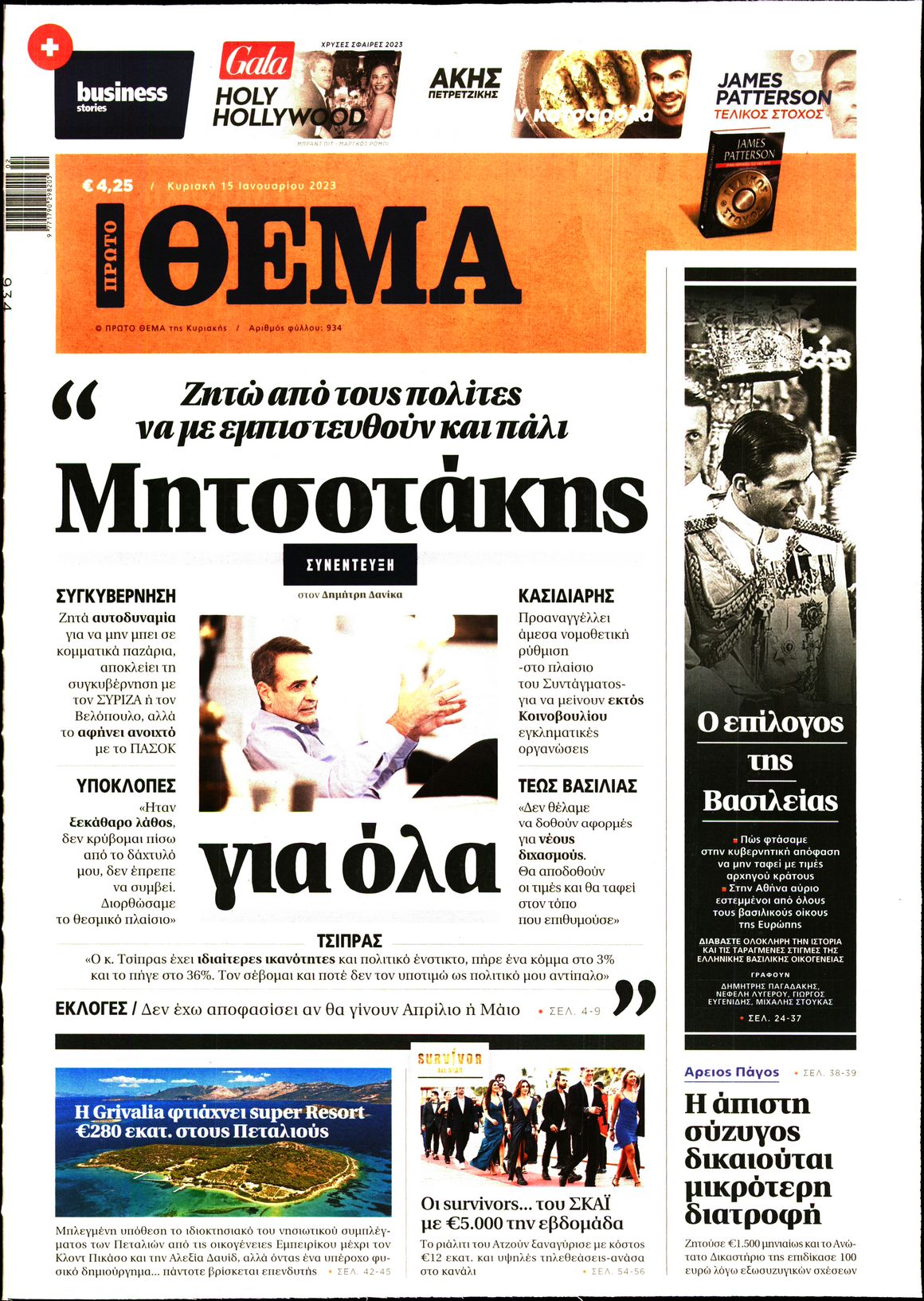 Οι εκλογές, η τουρκική προκλητικότητα, ο θάνατος του τέως βασιλιά Κωνσταντίνου και η μεγάλη συνέντευξη του Κυριάκου Μητσοτάκη ξεχωρίζουν μεταξύ άλλων στα πρωτοσέλιδα των κυριακάτικων εφημερίδων.