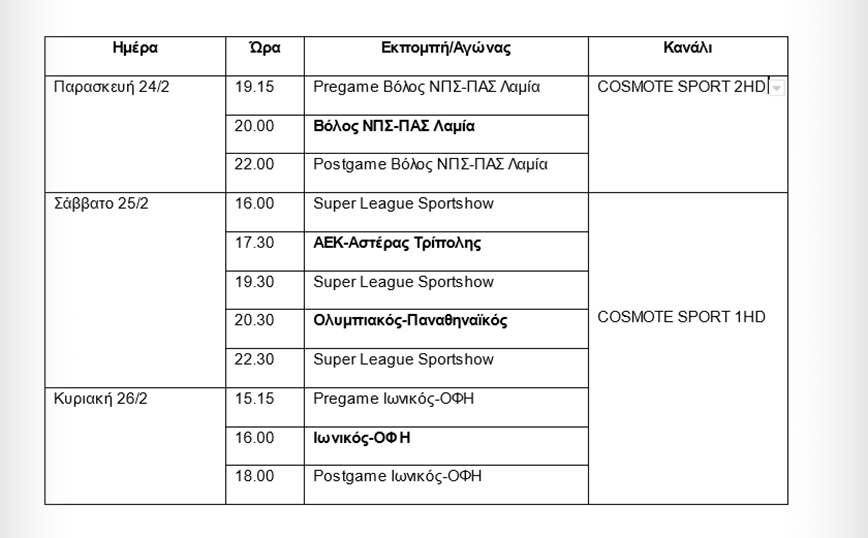 Την Παρασκευή 24/2, ο Βόλος θα υποδεχθεί τον ΠΑΣ Λαμία (20.00, COSMOTE SPORT 2HD), ενώ την επόμενη μέρα (Σάββατο 25/2), η ΑΕΚ θα φιλοξενήσει τον Αστέρα Τρίπολης (17.30, COSMOTE SPORT 1HD). H 24η αγωνιστική του πρωταθλήματος στην COSMOTE TV, θα ολοκληρωθεί την Κυριακή 26/2, με την αναμέτρηση Ιωνικός-ΟΦΗ (16.00, COSMOTE SPORT 1HD).