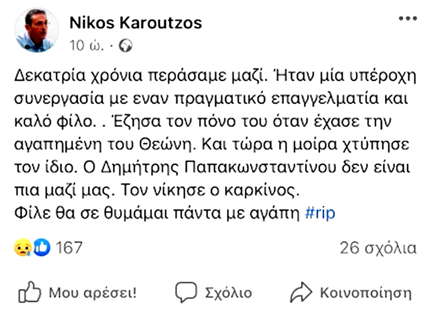 Τον δημοσιογράφο Δημήτρη Παπακωνσταντίνου αποχαιρετά με ανάρτησή του στο Facebook ο συνάδελφός του Νίκος Καρούτζος.