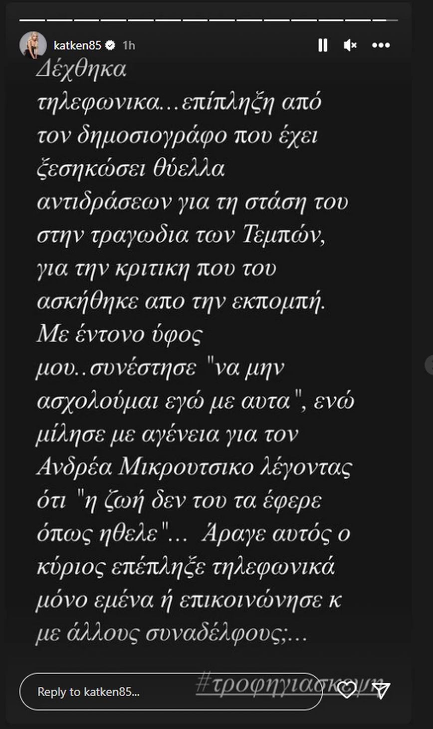 «Δέχτηκα τηλεφωνικά… επίπληξη από τον δημοσιογράφο που έχει ξεσηκώσει θύελλα αντιδράσεων για τη στάση του στην τραγωδία των Τεμπών, για την κριτική που του ασκήθηκε από την εκπομπή. Με έντονο ύφος μου… συνέστησε να “μην ασχολούμαι εγώ με αυτά” ενώ μίλησε με αγένεια για τον Ανδρέα Μικρούτσικο, λέγοντας ότι “η ζωή δεν του τα έφερε όπως ήθελε”… Άραγε αυτός ο κύριος επέπληξε τηλεφωνικά μόνο εμένα ή επικοινώνησε και με άλλους συναδέλφους; Τροφή για σκέψη» έγραψε η Κατερίνα Καινούργιου.