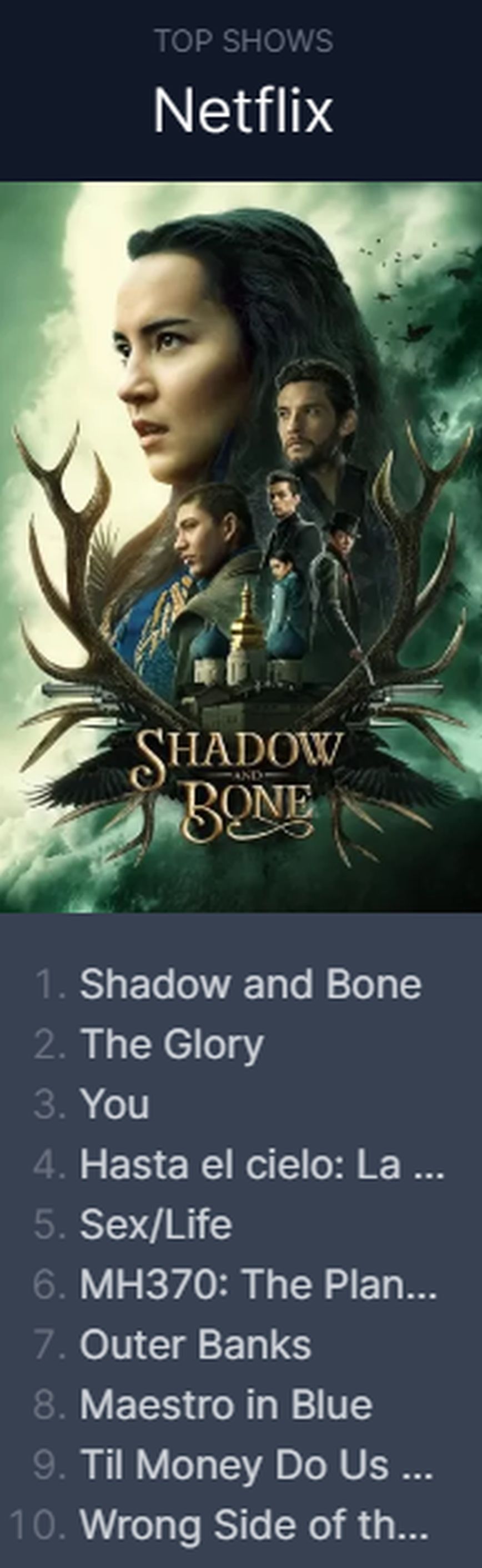 Σύμφωνα με το FlixPatrol που παρακολουθεί τα στατιστικά των streaming υπηρεσιών σε 156 διαφορετικές χώρες, η λίστα με τις κορυφαίες σειρές για την 20ή Μαρτίου διαμορφώθηκε ως εξής: