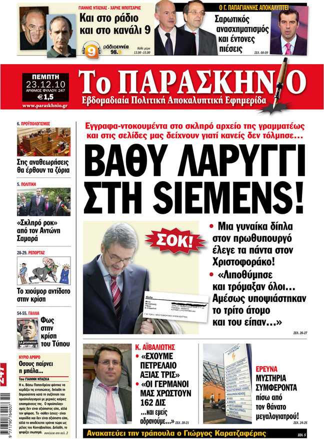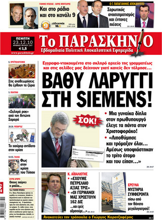 Ιδιαίτερο ενδιαφέρον παρουσιάζει το πρώτο θέμα της εφημερίδας «Παρασκήνιο», σύμφωνα με το οποίο η Siemens είχε εξασφαλίσει βαθύ λαρύγγι στην κυβέρνηση.