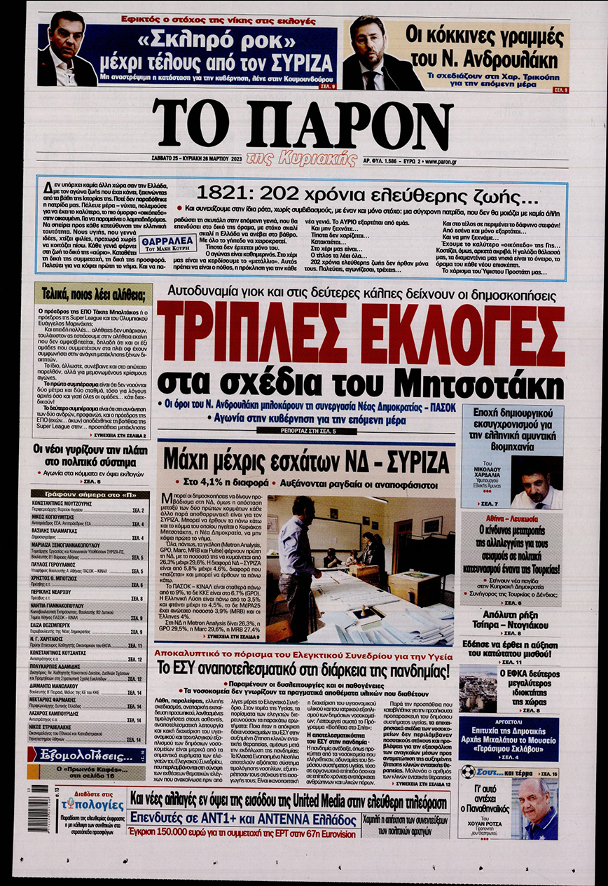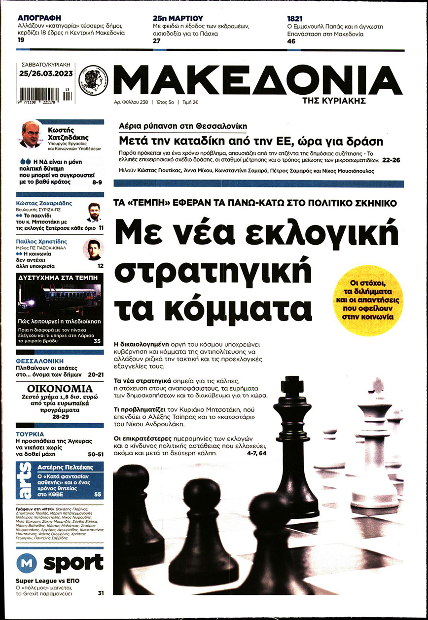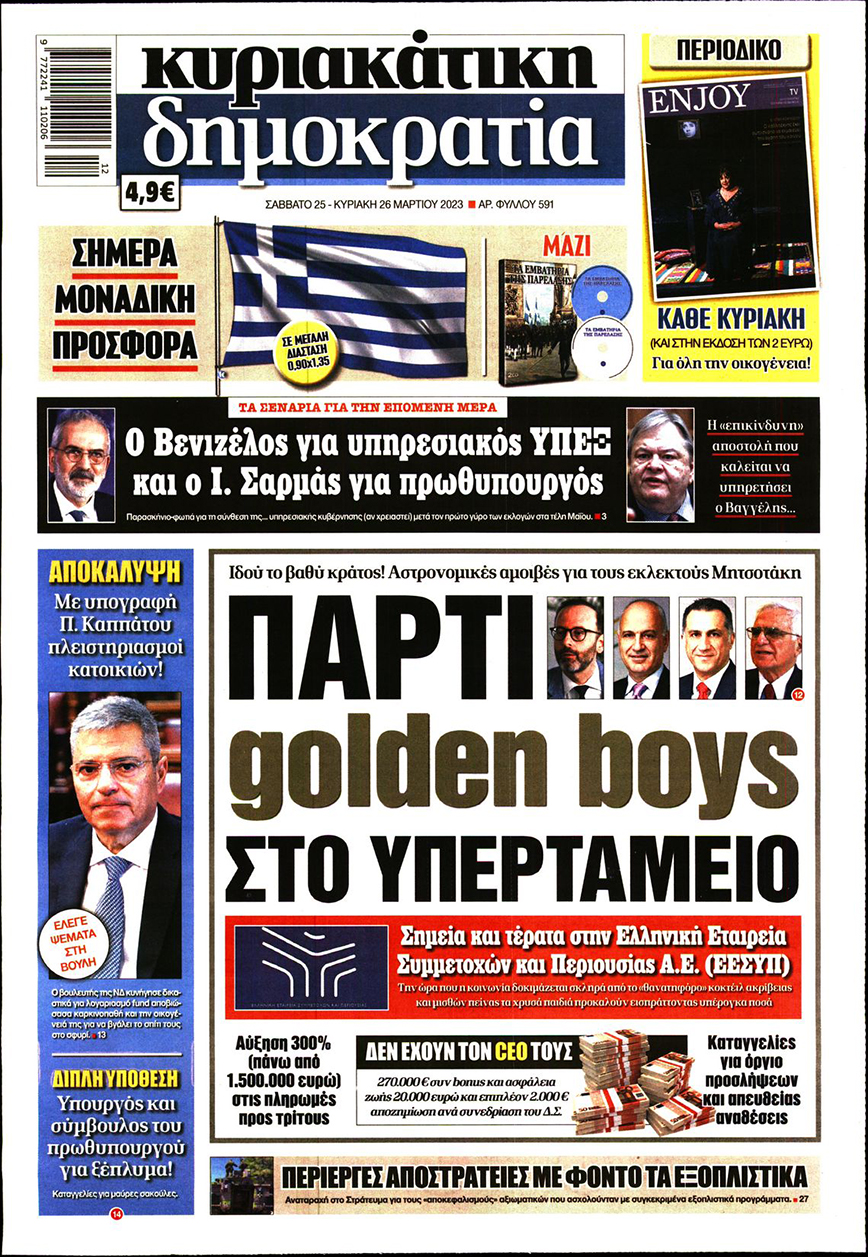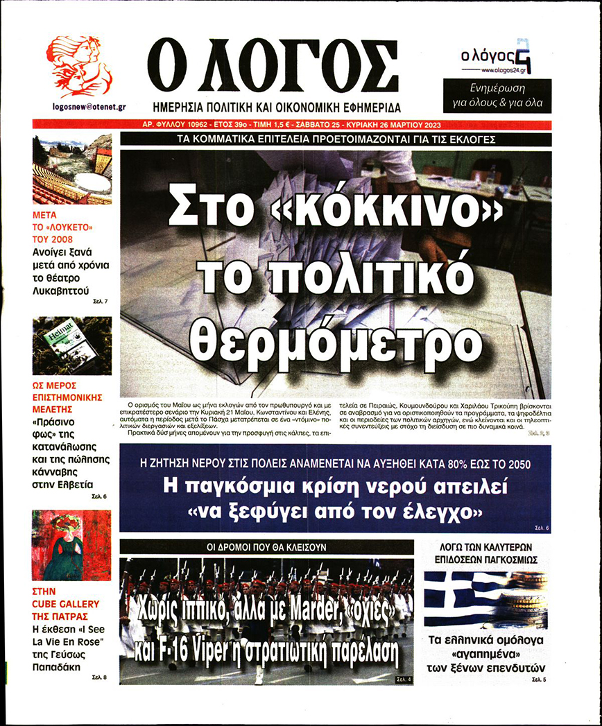 Τα πρωτοσέλιδα των κυριακάτικων εφημερίδων ασχολούνται με το πολιτικό θερμόμετρο που βρίσκεται στο κόκκινο ενόψει των εκλογών, αλλά και με την οικονομία. Λόγω της αργίας της 25ης Μαρτίου, οι κυριακάτικες εφημερίδες κυκλοφορούν εκτάκτων το Σάββατο.