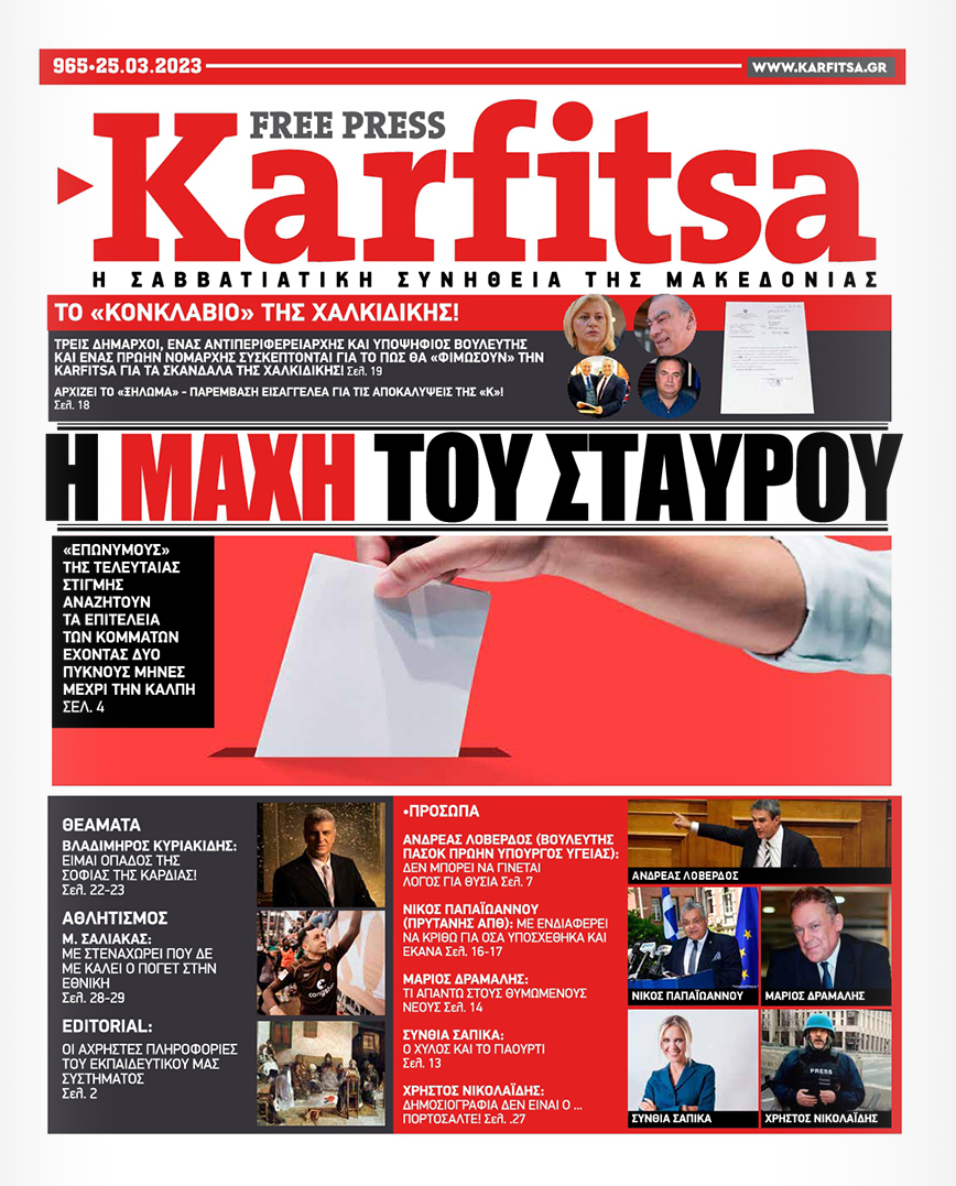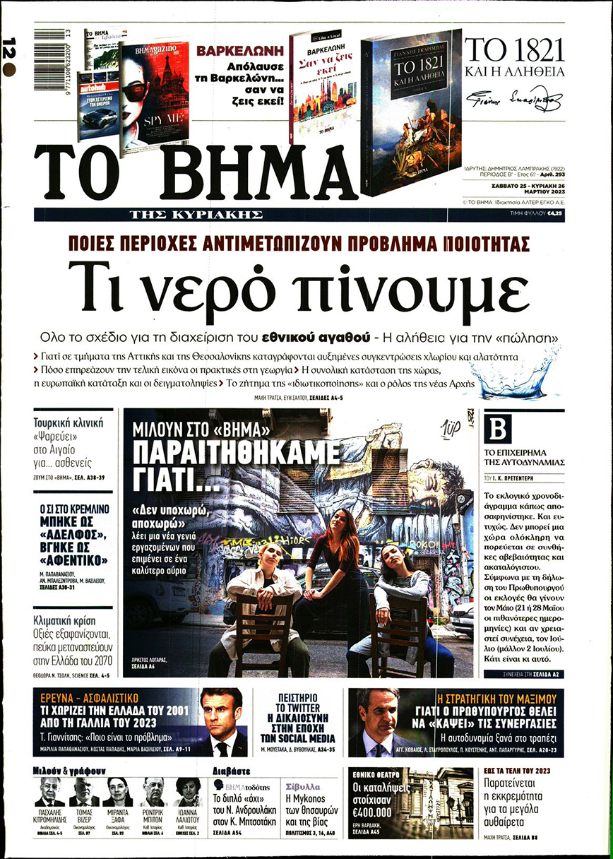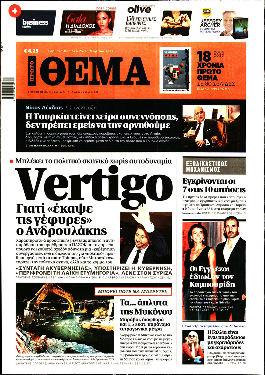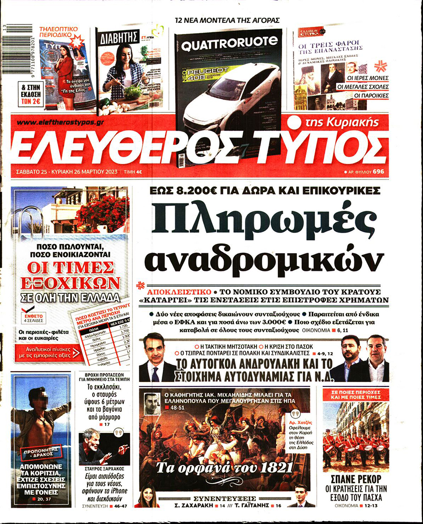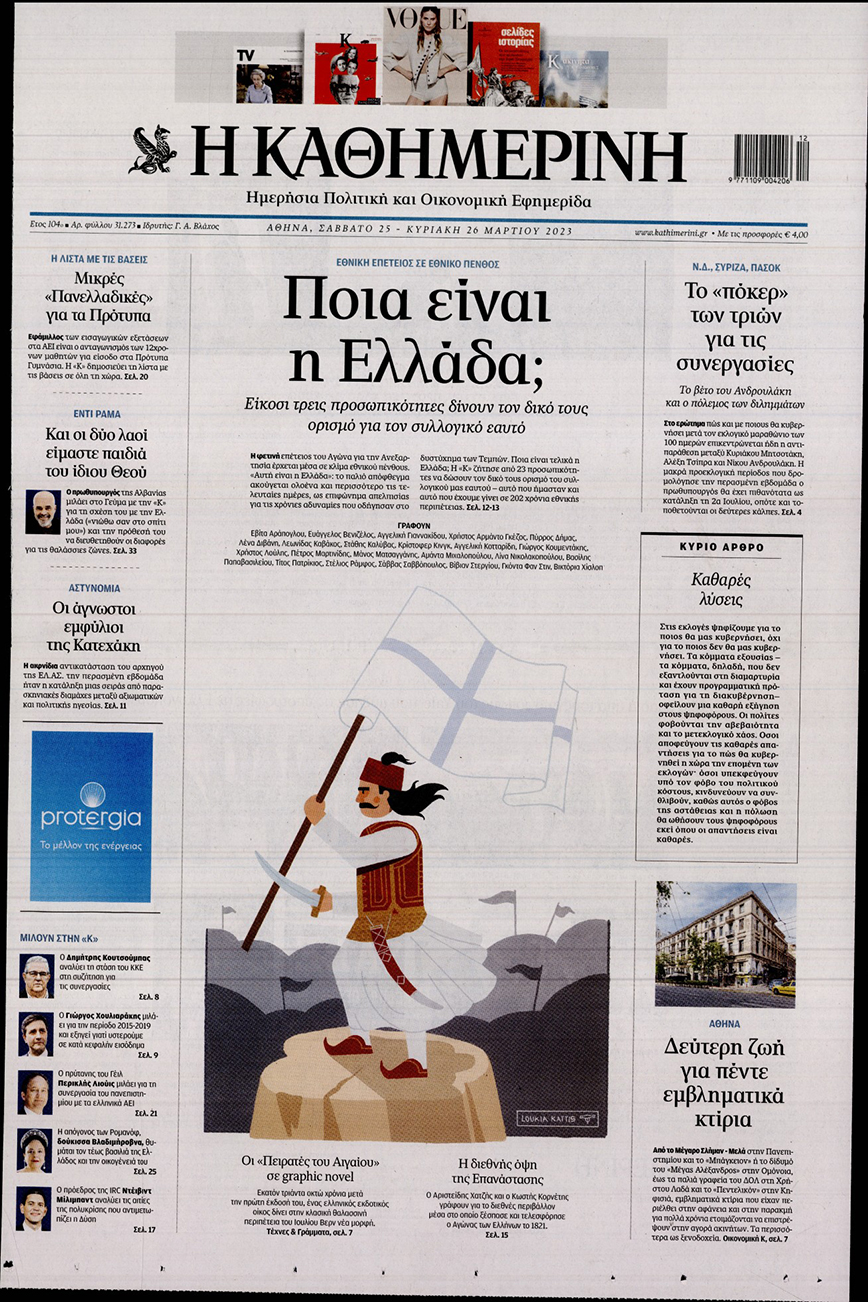 Τα πρωτοσέλιδα των κυριακάτικων εφημερίδων ασχολούνται με το πολιτικό θερμόμετρο που βρίσκεται στο κόκκινο ενόψει των εκλογών, αλλά και με την οικονομία. Λόγω της αργίας της 25ης Μαρτίου, οι κυριακάτικες εφημερίδες κυκλοφορούν εκτάκτων το Σάββατο.