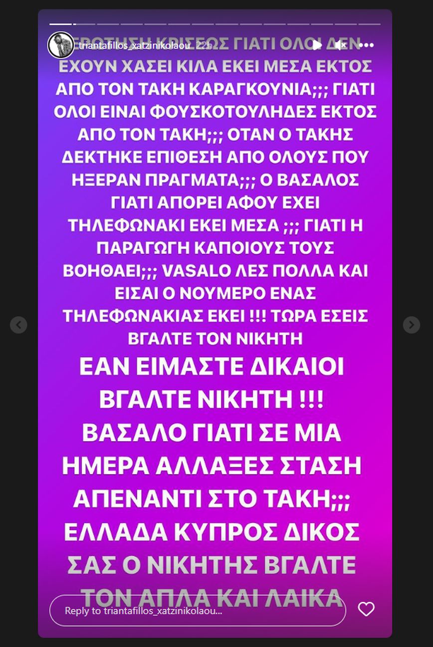 Για το γεγονός πως δεν έχει αδυνατίσει κανένας στο Survivor, έγραψε: «Ερώτηση κρίσεως, γιατί όλοι δεν έχουν χάσει κιλά εκεί μέσα εκτός από τον Τάκη Καραγκούνια; Γιατί όλοι φουσκοτούληδες εκτός από τον Τάκη; Όταν ο Τάκης δέχθηκε επίθεση από όλους που ήξεραν πράγματα; Ο Βάσαλος γιατί απορεί αφού έχει τηλεφωνάκι εκεί μέσα; Γιατί η παραγωγή κάποιους τους βοηθάει; Βασάλο λες πολλά και είσαι ο νούμερο 1 τηλεφωνάκιας εκεί!!! Τώρα εσείς βγάλτε τον νικητή. Εάν είμαστε δίκαιοι βγάλτε νικητή! Βασάλο γιατί σε μία ημέρα άλλαξες στάση απέναντι στον Τάκη; Ελλάδα, Κύπρος δικός σας ο νικητής βγάλτε τον απλά και λαϊκά».