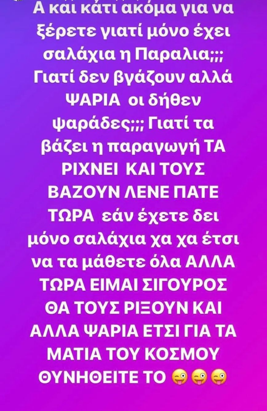 Στον προσωπικό του λογαριασμό στο Instagram, ο Τριαντάφυλλος ισχυρίστηκε: «Α και κάτι ακόμα για να ξέρετε, γιατί έχει μόνο σαλάχια η παραλία; Γιατί δεν βγάζουν άλλα ψάρια οι δήθεν ψαράδες; Γιατί τα βάζει η παραγωγή, τα ρίχνει και τους βάζουν, λένε πάτε τώρα. Εάν έχετε δει μόνο σαλάχια. Χα χα, έτσι να τα μάθετε όλα, αλλά τώρα είμαι σίγουρος θα τους ρίξουν κι άλλα ψάρια έτσι για τα μάτια του κόσμου, θυμηθείτε το».