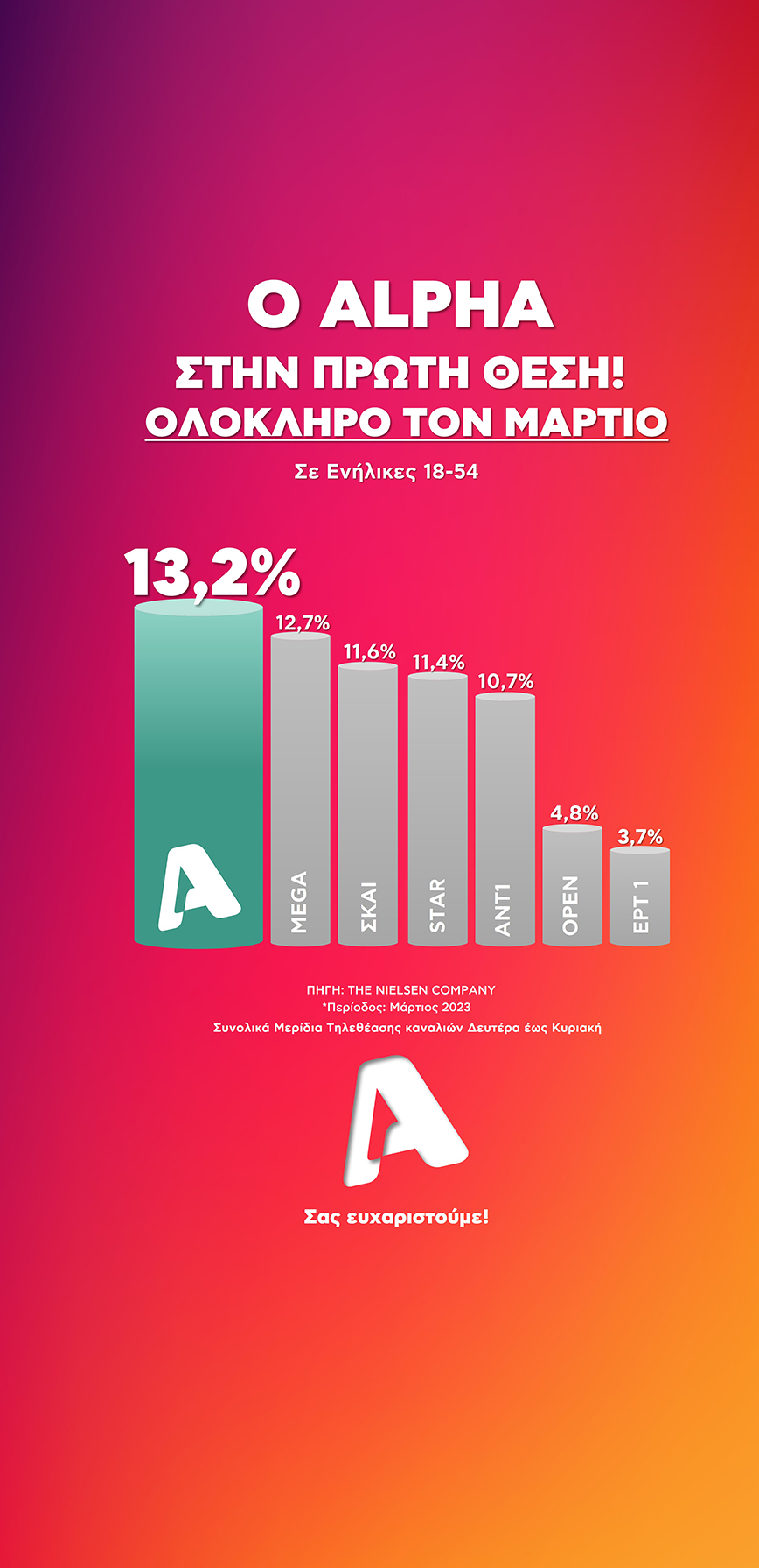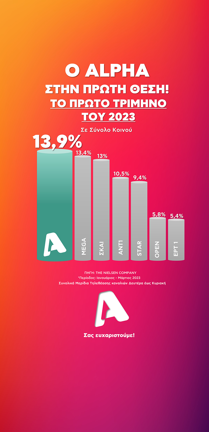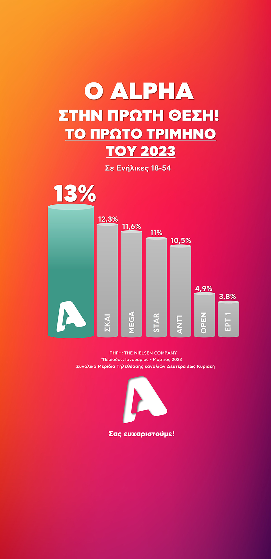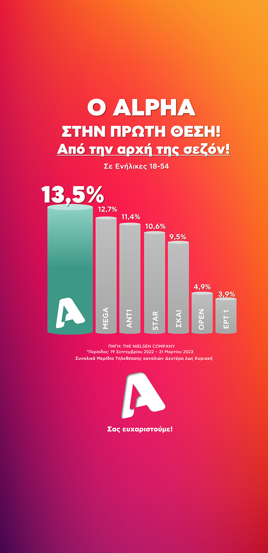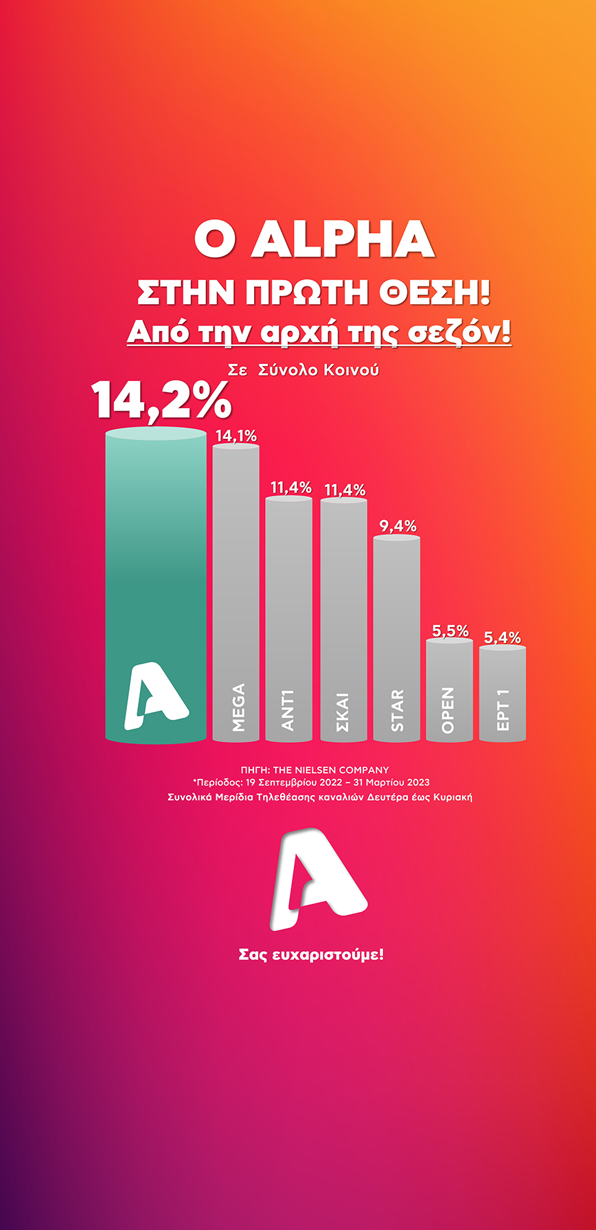 O Alpha κυριαρχεί στον ανταγωνισμό για μία ακόμη φορά και κρατάει τα ηνία της τηλεθέασης για τη σεζόν (19.09.2022 – 31.03.2023), Δευτέρα έως Κυριακή, στο σύνολο ημέρας. Είναι πρώτος στο σύνολο πληθυσμού με 14,2% και πρώτος στο δυναμικό κοινό 18-54 με 13,5%. Παράλληλα, είναι πρώτος για το πρώτο τρίμηνο του 2023 (01.01.2023- 31.03.2023) στο σύνολο του πληθυσμού με 13,9% και πρώτος στο δυναμικό κοινό 18-54 με 13%. Επίσης είναι πρώτος ολόκληρο τον Μάρτιο (01.03.2023 – 31.03.2023) στο δυναμικό κοινό 18-54 με 13,2%.