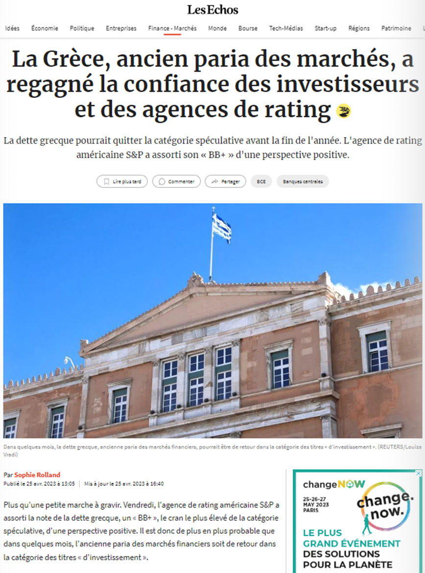 Σε δημοσίευμα υπό τον τίτλο «Η Ελλάδα, πρώην παρίας των χρηματαγορών, ανέκτησε την εμπιστοσύνη των επενδυτών και των οίκων αξιολόγησης» η γαλλική οικονομική εφημερίδα Les Échos σημειώνει ότι την Παρασκευή, ο αμερικανικός οίκος αξιολόγησης S&P συνόδευσε την αξιολόγηση του ελληνικού χρέους, στη «BB+», την υψηλότερη βαθμίδα της κερδοσκοπικής κατηγορίας, με θετική προοπτική και ότι είναι όλο και πιο πιθανό «σε λίγους μήνες, ο πρώην παρίας των χρηματοπιστωτικών αγορών να επανέλθει στην κατηγορία των “επενδυτικών” τίτλων».