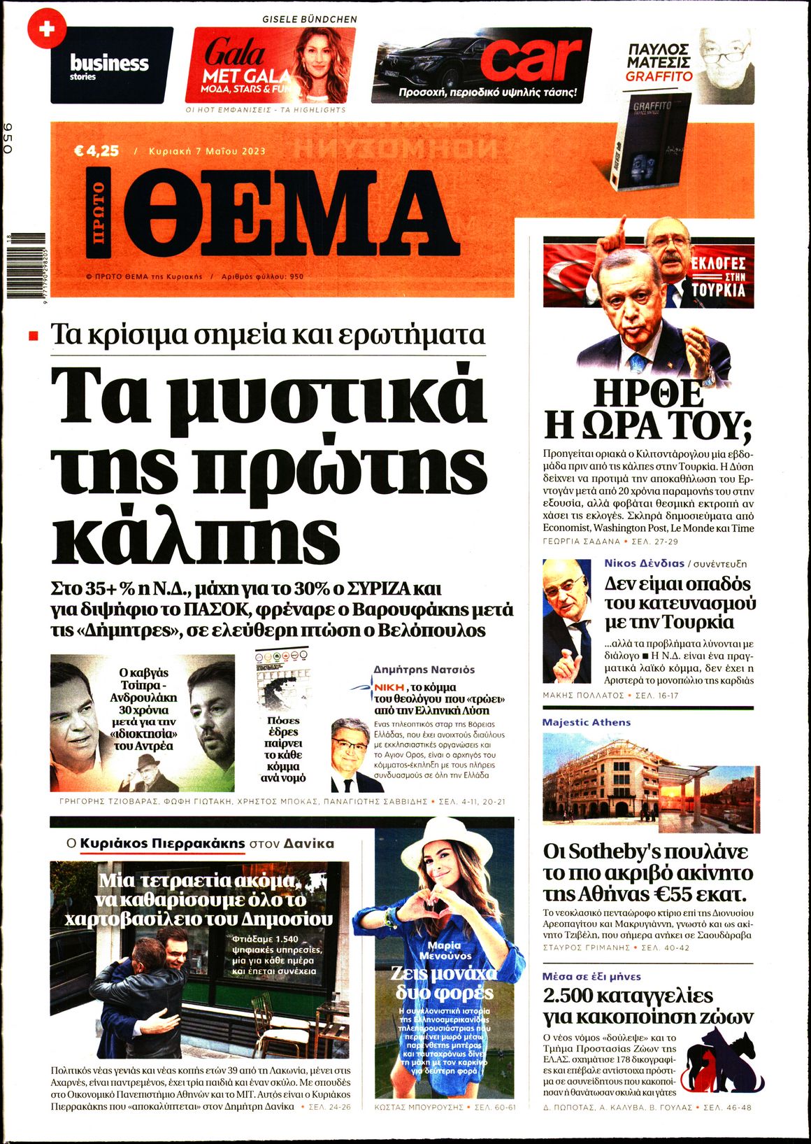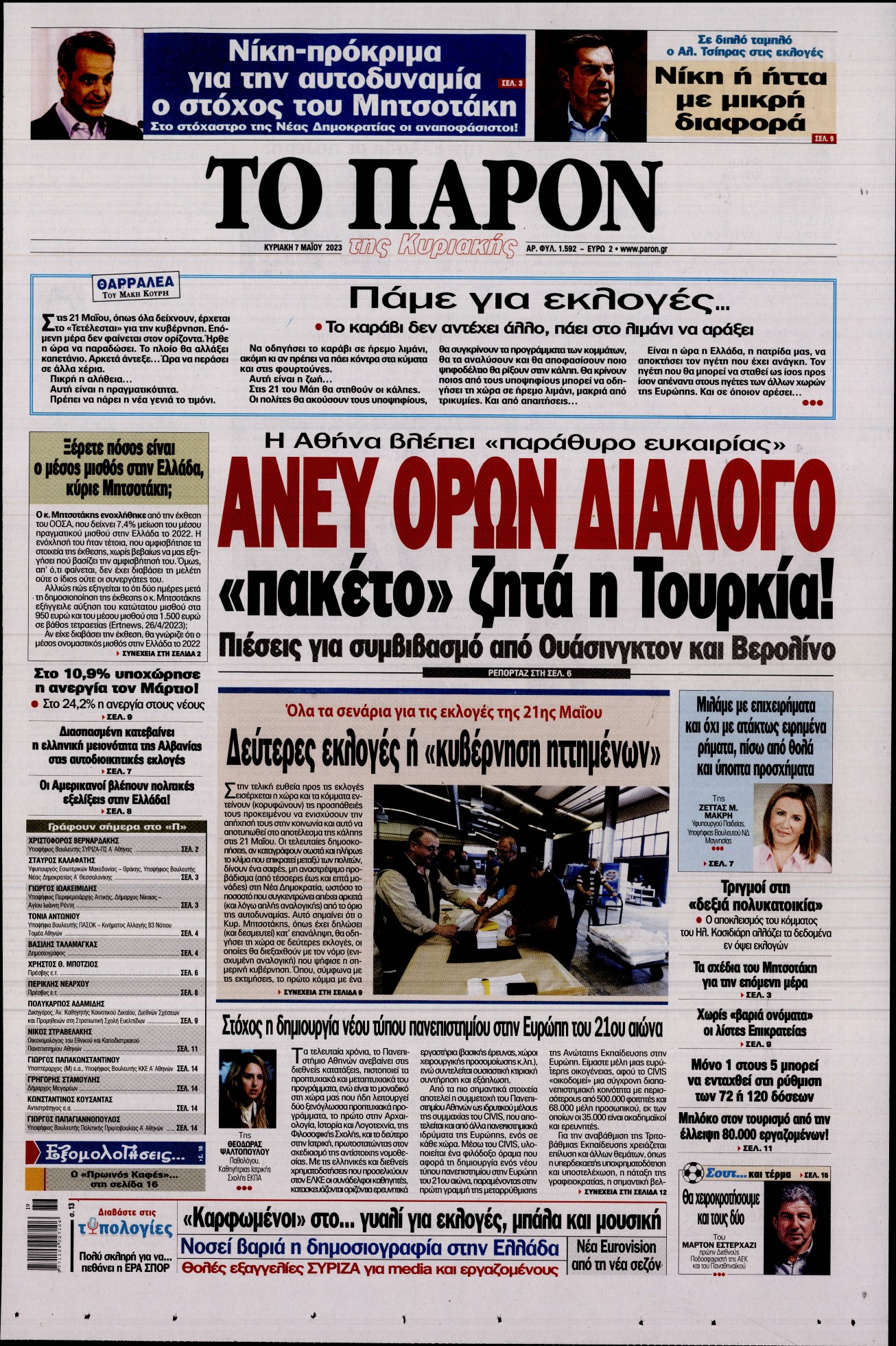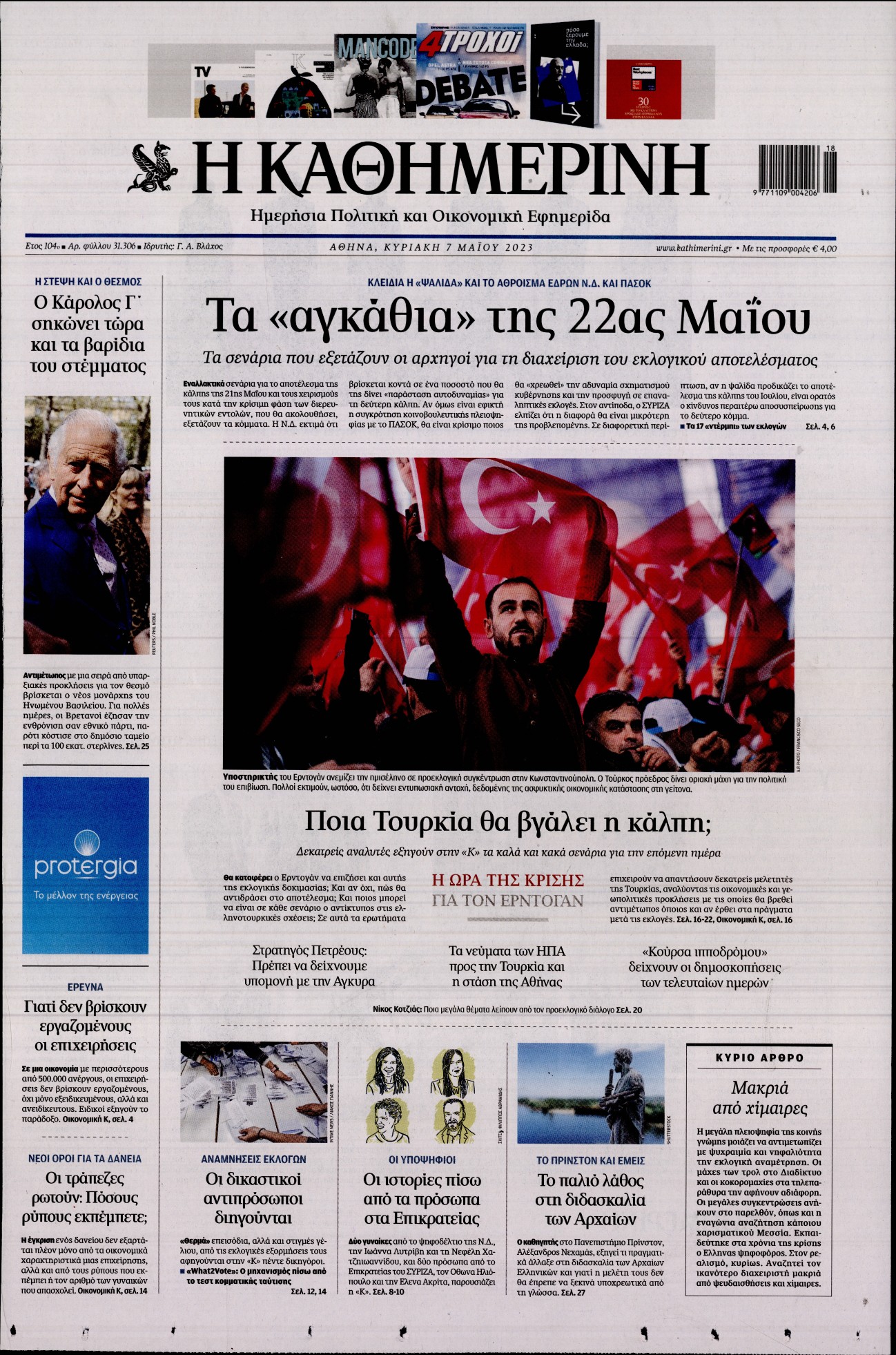 Τα δεδομένα ενόψει των εκλογών της 21ης Μαΐου και οι εκλογές στην Τουρκία ξεχωρίζουν στα πρωτοσέλιδα των κυριακάτικων εφημερίδων.