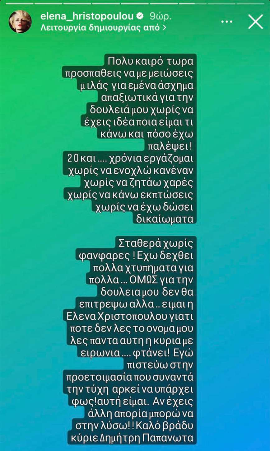 «Πολύ καιρό τώρα προσπαθείς να με μειώσεις μιλάς για εμένα άσχημα που σχετικά για τη δουλειά μου χωρίς να έχεις ιδέα ποια είμαι τι κάνω και πως έχω παλέψει. 20 και χρόνια εργάζομαι χωρίς να ενοχλώ κανέναν χωρίς να ζητάω χαρές χωρίς να κάνω εκπτώσεις χωρίς να έχω δώσει δικαιώματα. Σταθερά χωρίς φανφάρες. Έχω δεχτεί πολλά χτυπήματα για πολλά όμως και τη δουλειά μου δεν θα επιτρέψω άλλα. Είμαι η Έλενα Χριστόπουλου για τίποτε δε λες το όνομά μου λες πάντα “αυτή η κυρία” με ειρωνεία… φτάνει! Εγώ πιστεύω στην προετοιμασία που συναντά την τύχη αρκεί να υπάρχει φως. Αυτή είμαι. Αν έχεις άλλη απορία μπορώ να σου την λύσω. Καλό βράδυ κύριε Δημήτρη Παπανώτα» επεσήμανε στην ανάρτησή της η Έλενα Χριστοπούλου.