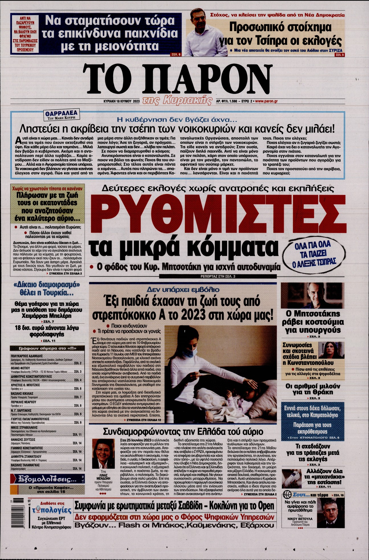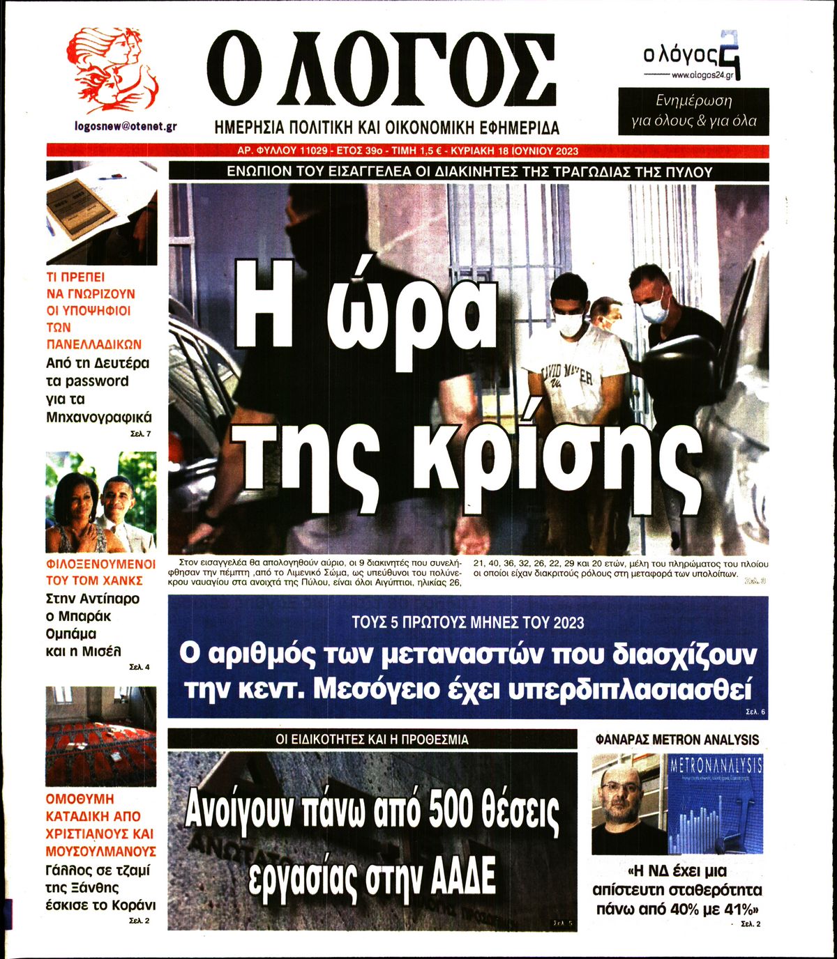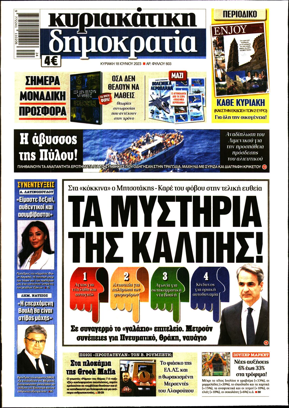 Τα δεδομένα ενόψει των κρίσιμων εκλογών της 25ης Ιουνίου, το ναυάγιο στην Πύλο και οι βάσεις στις Πανελλήνιες ξεχωρίζουν στα πρωτοσέλιδα των κυριακάτικων εφημερίδων.