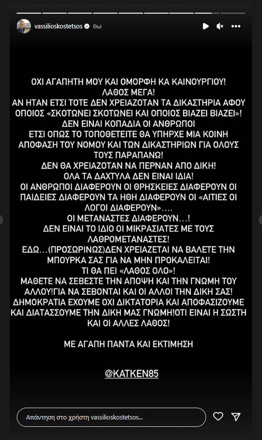 Οι μετανάστες διαφέρουν…! Δεν είναι το ίδιο οι μικρασιάτες με τους λαθρομετανάστες! Εδώ… (προσωρινώς) δεν χρειάζεται να βάλετε την μπούρκα σας για να μην προκαλείται! Τι θα πει “λάθος όλο”! Μάθετε να σέβεστε την άποψη και τη γνώμη του άλλου! Για να σέβονται και οι άλλοι την δική σας. Δημοκρατία έχουμε, όχι δικτατορία και αποφασίζουμε και διατάσσουμε τη δική μας γνώμη. Ότι είναι η σωστή και οι άλλες λάθος. Με αγάπη και εκτίμηση» έγραψε χαρακτηριστικά ο Βασίλειος Κωστέστος στον προσωπικό του λογαριασμό στο Instagram.