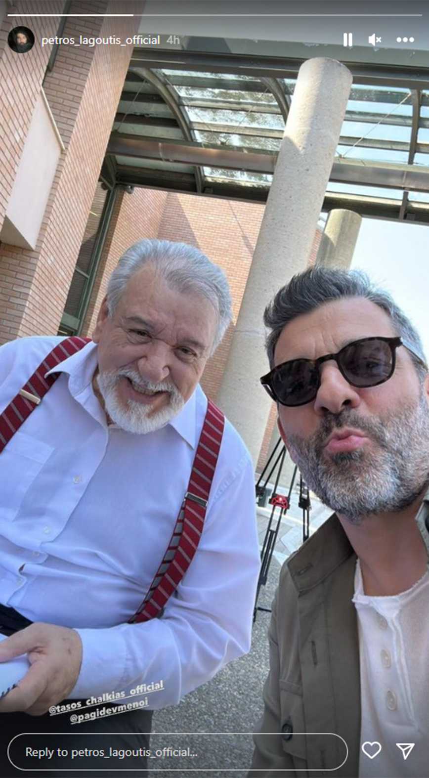 Ο ηθοποιός Πέτρος Λαγούτης, βρέθηκε στο πλευρό του Τάσου Χαλκιά κατά τη διάρκεια των γυρισμάτων και απαθανάτισε την στιγμή ενώ στην συνέχεια μοιράστηκε τη φωτογραφία με τους διαδικτυακούς του φίλους μέσω του προσωπικού του λογαριασμού στο Instagram.