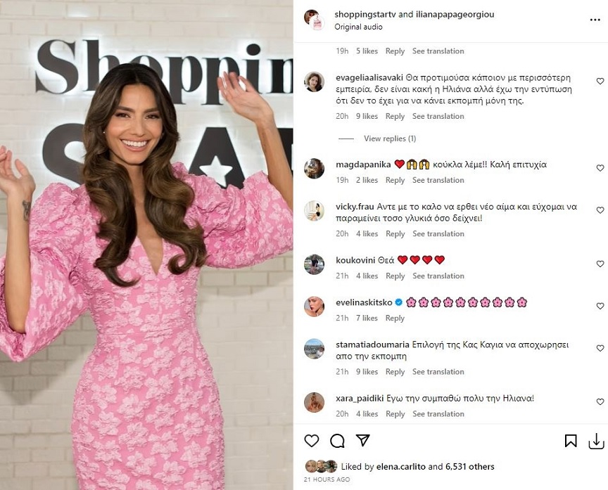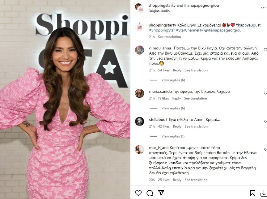 Με την παρουσιάστρια – μοντέλο να δημοσιεύει στον λογαριασμό της στο Instagram ένα πρώτο… δείγμα από τη νέα εκπομπή που θα παρουσιάσει, ακολούθησαν «βροχή» και τα σχόλια. Άλλωστε, η πρεμιέρα του «Shopping Star» είναι ήδη πολυαναμενόμενη μιας και στους διαδικτυακούς… δρόμους έχουν ήδη αρχίσει οι συγκρίσεις με την προηγούμενη παρουσιάστρια τη Βίκυ Καγιά. Επιπλέον, η Ηλιάνα Παπαγεωργίου συμμετέχει για δεύτερη φορά σε πρότζεκτ το οποίο είναι συνυφασμένο με την Καγιά, έπειτα από την παρουσία της στο ριάλιτι μόδας GNTM.