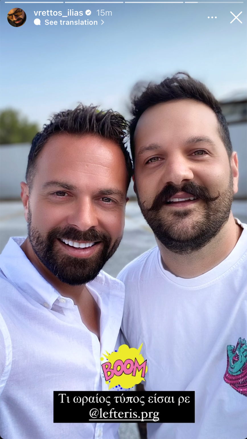 Λίγο πριν ξεκινήσουν τα γυρίσματα του νέου τηλεπαιχνιδιού Το Πιο Μεγάλο Παζάρι στον Alpha, ο Ηλίας Βρεττός και ο Λευτέρης Μητσόπουλος συναντήθηκαν και απαθανάτισαν τη στιγμή. Μάλιστα, ο Ηλίας Βρεττός «ανέβασε» σε story στον προσωπικό του λογαριασμό στο Instagram τη φωτογραφία, σχολιάζοντας τι ωραίος τύπος είναι ο Λευτέρης.