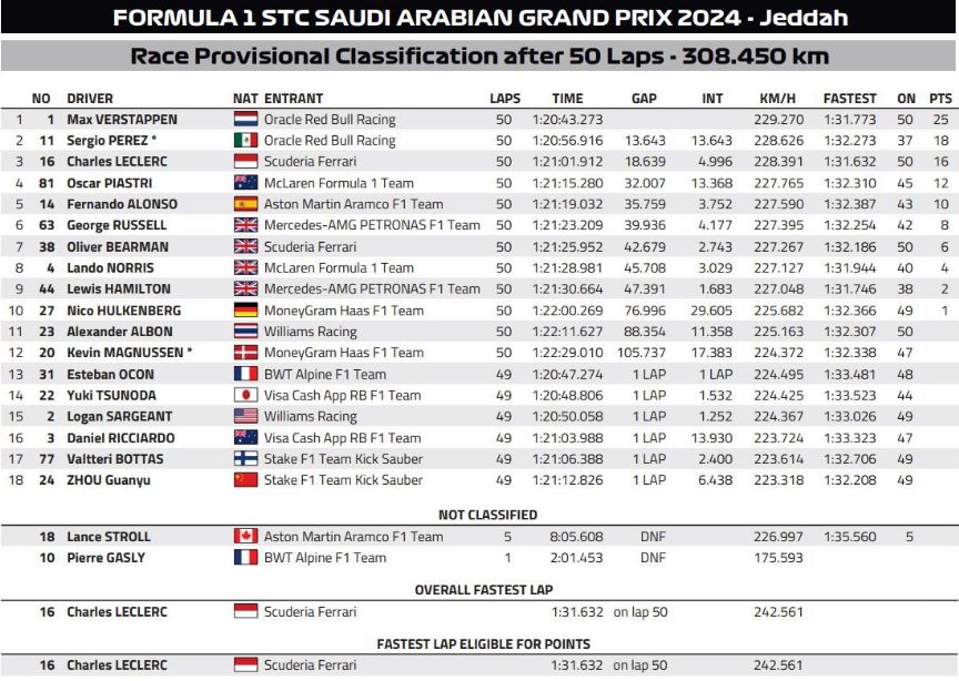 Η τελική κατάταξη του 2ου Grand Prix στη Σαουδική Αραβία έχει ως εξής: