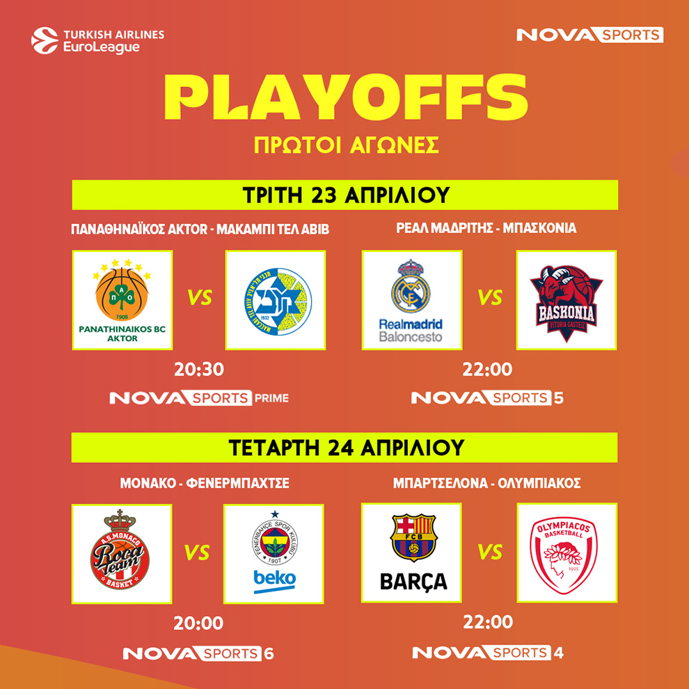 Η EuroLeague, η κορυφαία ευρωπαϊκή διασυλλογική διοργάνωση στο χώρο του μπάσκετ που οι φίλοι της πορτοκαλί μπάλας απολαμβάνουν αποκλειστικά στο παρκέ του Novasports με την κορυφαία δημοσιογραφική ομάδα των Playmakers, ετοιμάζεται για το τζάμπολ στα Playoffs! Το Novasports θα είναι εκεί για να καλύψει με τον αρτιότερο τρόπο την προσπάθεια του Παναθηναϊκού AKTOR κόντρα στην Μάκαμπι Τελ Αβιβ και του Ολυμπιακού κόντρα στην Μπαρτσελόνα για πρόκριση στο Final Four του Βερολίνου, καθώς και τα άλλα δύο ζευγάρια Ρεάλ Μαδρίτης – Μπασκόνια και Μονακό – Φενέρμπαχτσε.