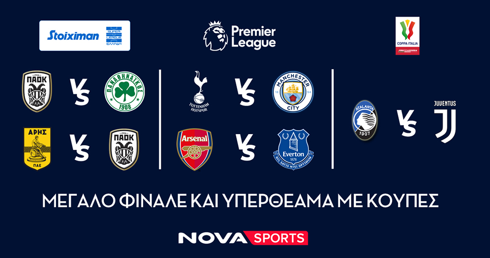 Ποδοσφαιρικό υπερθέαμα με περισσότερους από 65 LIVE αγώνες που θα καθορίσουν τίτλους και ευρωπαϊκά εισιτήρια έρχεται αποκλειστικά στο γήπεδο του Novasports! Με το φινάλε στα Playoffs της Stoiximan Super League και τα ντέρμπι ΠΑΟΚ – Παναθηναϊκός και Άρης – ΠΑΟΚ, με το φινάλε στην Premier League με το εξ’ αναβολής ντέρμπι Τότεναμ – Μάντσεστερ Σίτι και την τελευταία αγωνιστική με παράλληλη μετάδοση όλων των αγώνων, με το φινάλε σε Bundesliga, Ligue1, Eredivise και παράλληλη μετάδοση όλων των αγώνων στην LaLiga EA Sports! Και φυσικά με τον τελικό του Coppa Italia, Αταλάντα – Γιουβέντους, αλλά και με την τελική φάση της Super League K15 όπου Άρης, Ολυμπιακός, Παναθηναϊκός και ΠΑΟΚ διεκδικούν το τρόπαιο.