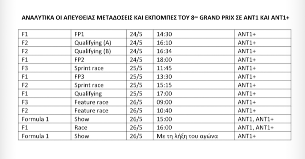 Οι λάτρεις της Formula 1 θα έχουν την ευκαιρία να παρακολουθήσουν τις ελεύθερες και τις κατατακτήριες δοκιμές των μονοθέσιων, την Παρασκευή 24 Μαΐου και το Σάββατο 25 Μαΐου, αποκλειστικά στο ΑΝΤ1+.