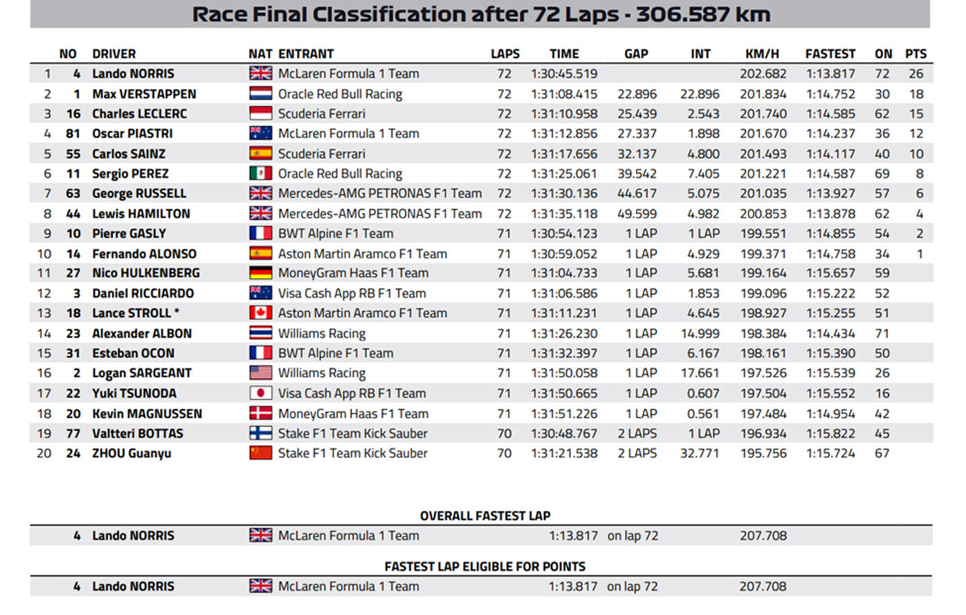 Απόλυτος κυρίαρχος αναδείχθηκε ο Λάντο Νόρις, ο Μαξ Φερστάπεν με τη Red Bull έμεινε στη 2η θέση, ενώ ο Σαρλ Λεκλέρ με την -όχι ιδιαίτερα ανταγωνιστική- Ferrari έκανε έναν από τους καλύτερους φετινούς αγώνες του.