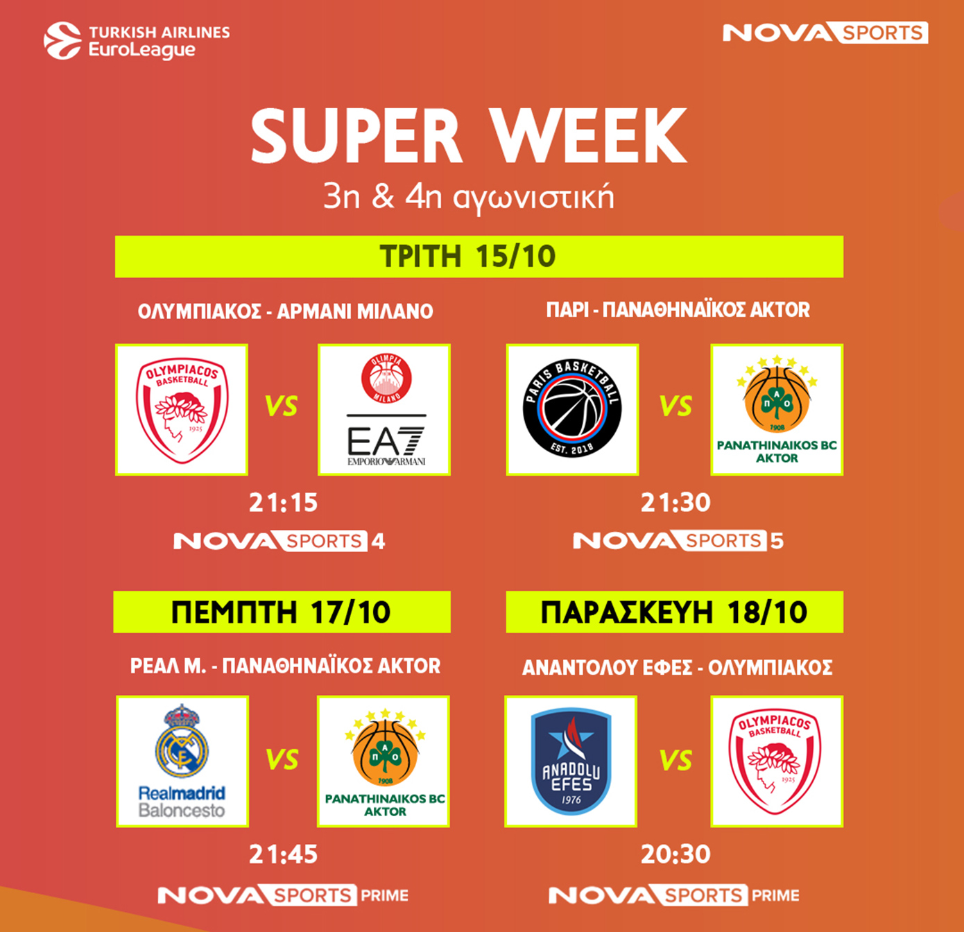 Η EuroLeague, η κορυφαία ευρωπαϊκή διασυλλογική διοργάνωση στο χώρο του μπάσκετ ετοιμάζεται για την πρώτη «διαβολοβδομάδα» στο παρκέ του Novasports! Οι προβολείς στρέφονται στις αναμετρήσεις των ελληνικών ομάδων, Ολυμπιακός – Αρμάνι Μιλάνο (15/10, 21:15) & Παρί – Παναθηναϊκός AKTOR (15/10, 21:30) για την 3η αγωνιστική και Ρεάλ Μαδρίτης – Παναθηναϊκός AKTOR (17/10, 21:45) στην αναβίωση του περυσινού τελικού της EuroLeague με τους «πράσινους» να στέφονται πρωταθλητές Ευρώπης για 7η φορά στην ιστορία τους & Αναντολού Εφές – Ολυμπιακός (18/10, 20:30) για την 4η αγωνιστική.