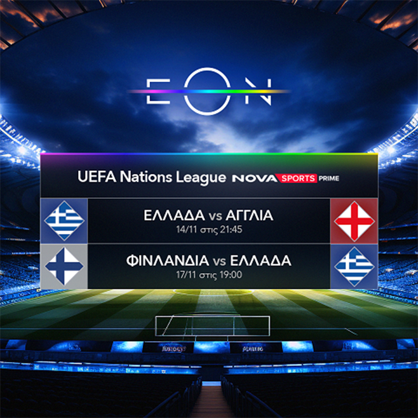 Στο UEFA Nations League η Εθνική μας ομάδα με τον Ιβάν Γιοβάνοβιτς πάγκο μετά το 4Χ4 στις τέσσερις πρώτες αγωνιστικές υποδέχεται στο ΟΑΚΑ την Αγγλία (14/11, 21:45) και αντιμετωπίζει εκτός έδρας την Φινλανδία (17/11, 19:00) με στόχο να συνεχίσει τα θετικά αποτελέσματα, κατακτώντας την πρώτη θέση και την άνοδο στη League A που οδηγεί στους τελικούς και στην ελπίδα για εισιτήριο στο Μουντιάλ του 2026. Οι αγώνες της «γαλανόλευκης» θα μεταδοθούν στο Novasports Prime σε περιγραφή του Χρήστου Σωτηρακόπουλου και σχόλιο του Ντέμη Νικολαΐδη.