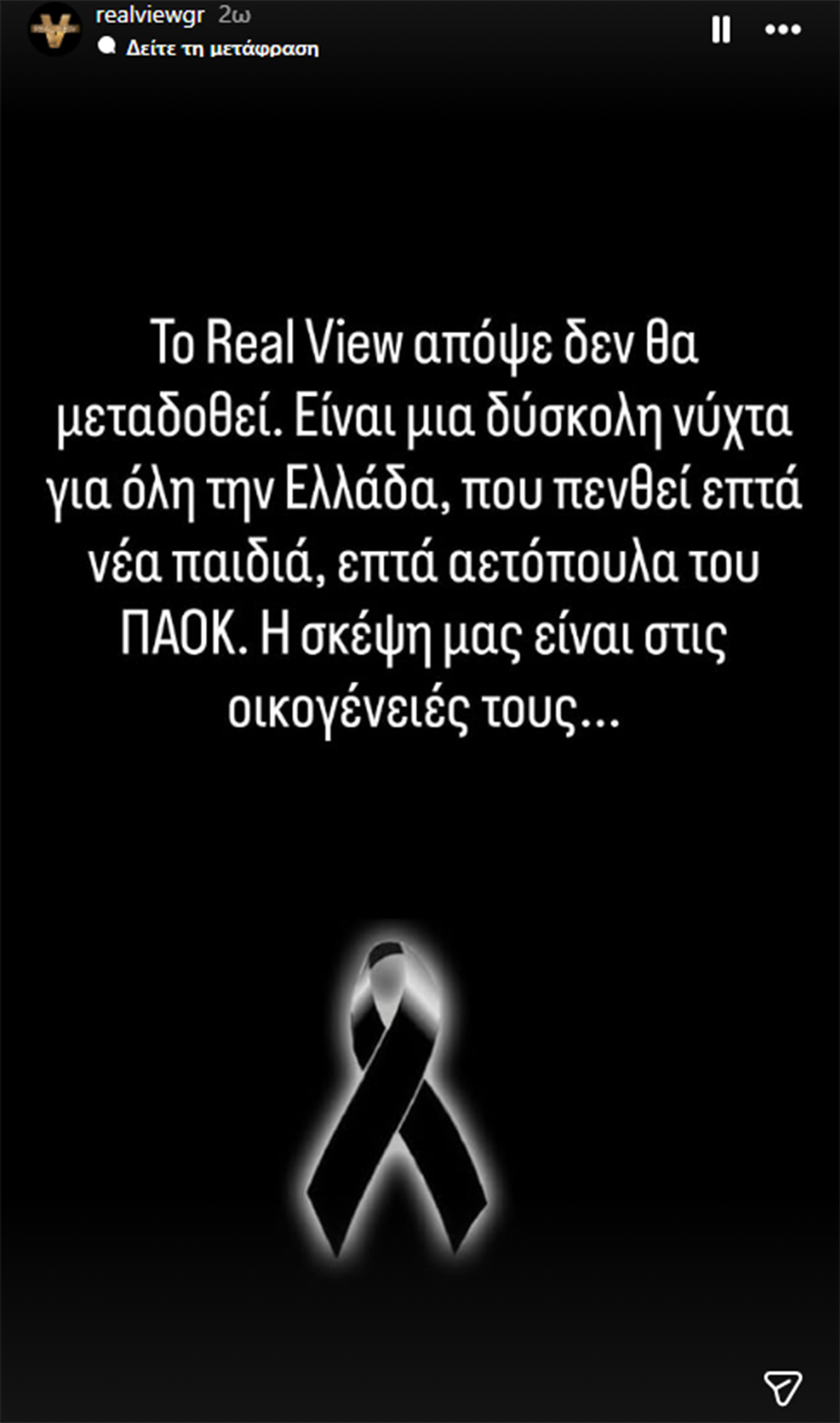 «Το Real View απόψε δεν θα μεταδοθεί. Είναι μια δύσκολη νύχτα για όλη την Ελλάδα, που πενθεί επτά νέα παιδιά, επτά αετόπουλα του ΠΑΟΚ. Η σκέψη μας είναι στις οικογένειές τους…», ανέφερε η ανακοίνωση της εκπομπής» ήταν το μήνυμα στον επίσημο λογαριασμό της εκπομπής στο Instagram.