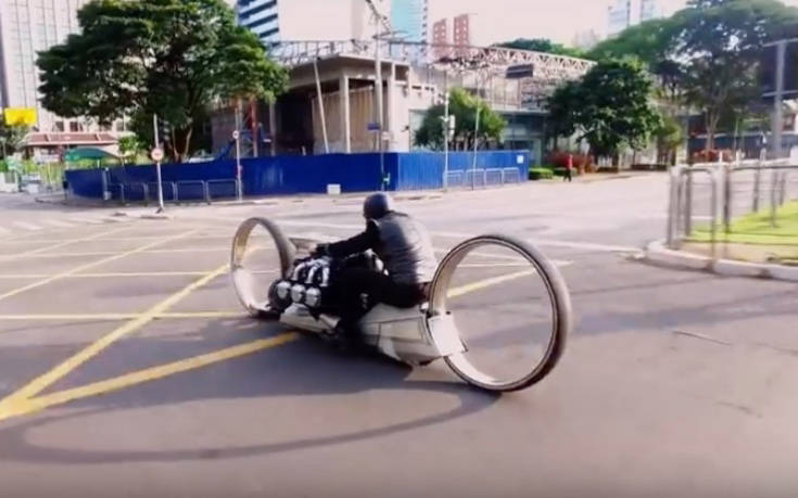 Οι δύο τεράστιοι τροχοί 36 ιντσών είναι χωρίς κέντρο και συνδέονται με τη μοτοσυκλέτα με ψαλίδια που βρίσκονται χαμηλά τοποθετημένα, ενώ χαμηλή είναι και η θέση οδήγησης, με τον αναβάτη να κάθεται μπροστά από τον κινητήρα.