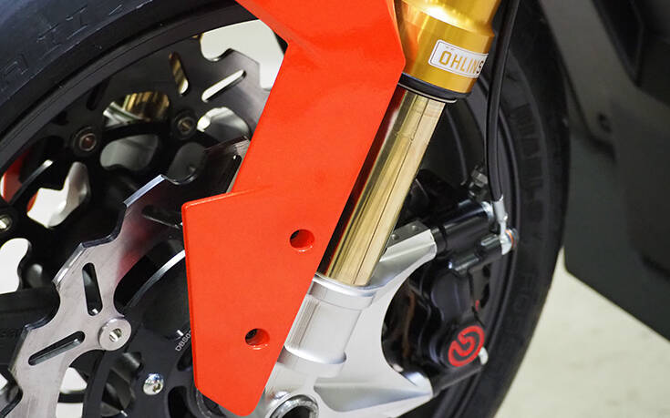 Το πλαίσιό της είναι ένα πανάλαφρο κράμα αλουμινίου και είναι εφοδιασμένη με όλα τα καλά της αγοράς, όπως αναρτήσεις Ohlins, φρένα Brembo και ελαστικά Pirelli Diablo Rosso 2.