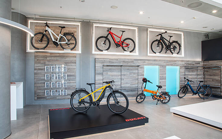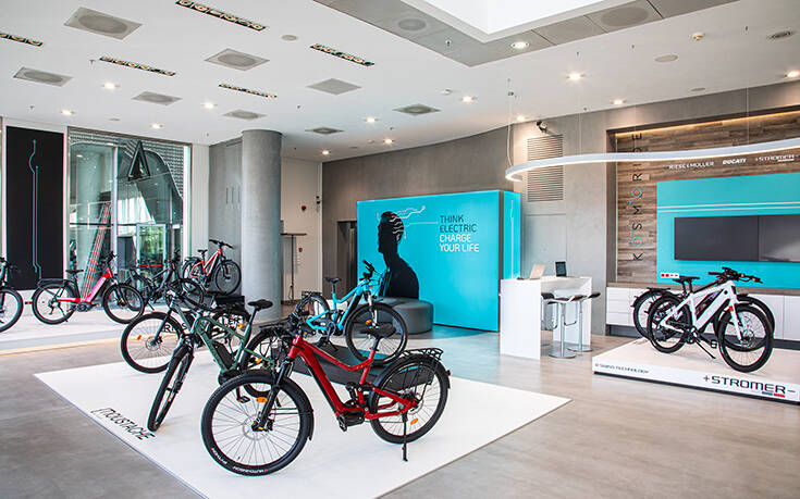 Σε έναν ιδιαίτερα κομψό χώρο με εντυπωσιακό βιομηχανικό design στο οποίο κυριαρχεί το τυρκουάζ, το εταιρικό χρώμα της Kosmoride, φιλοξενούνται περισσότερα από 35 ηλεκτρικά ποδήλατα από 6 από τις πιο γνωστές μάρκες e-Bikes στον κόσμο. Εδώ κάποιος θα βρει ηλεκτρικά ποδήλατα της ελβετικής STROMER, τα γερμανικά RIESE & MÜLLER, τα MOUSTACHE από τη Γαλλία, τα νέα ηλεκτρικά μοντέλα της θρυλικής DUCATI, τα τελευταία μοντέλα e-Bikes του παγκόσμιου ποδηλατικού κολοσσού GIANT και τα σπαστά ηλεκτρικά ποδήλατα της ολλανδικής LACROS.