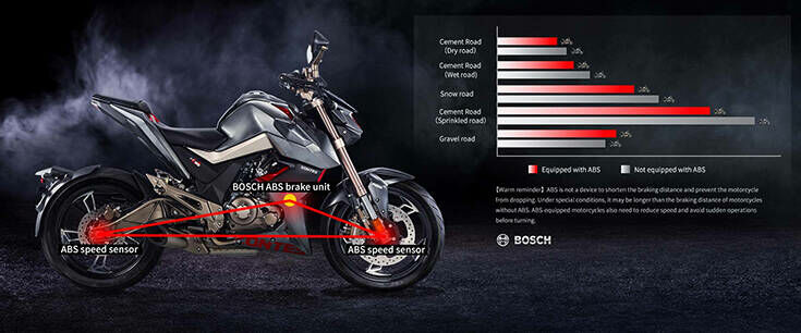 Διαθέτει ισχυρή δύναμη και αίσθηση πέδησης με μεγάλο δισκόφρενο 300mm εμπρός με διπίστονες δαγκάνες και δισκόφρενο 230mm πίσω, ελεγχόμενα από δικάναλο σύστημα ABS της BOSCH.