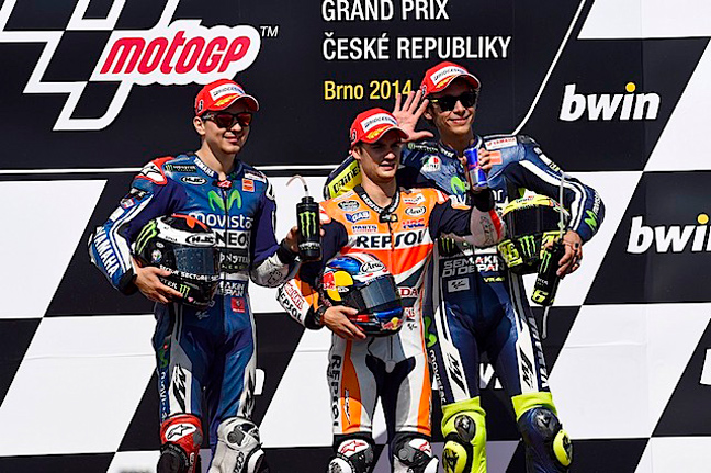 Στο Brno τον κέρδισαν όχι ένας αλλά τρεις: ο Pedrosa, o Lorenzo και ο Rossi. Απίστευτο φαίνεται, αλλά ο ως χτες αήττητος πρωταθλητής δεν ανέβηκε καν στο βάθρο! Τερμάτισε μόλις 4ος, 5 δευτερόλεπτα πίσω από τον 3ο Rossi.